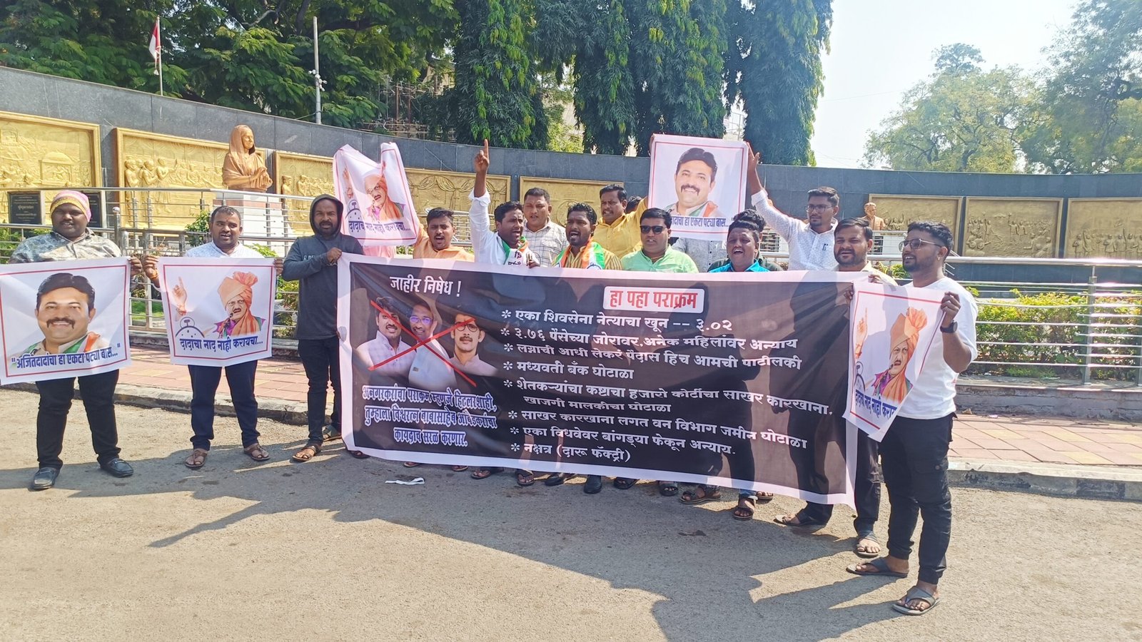 सोलापूर – मोहोळ तालुक्यातील अनगर नगरपरिषद निवडणुकीत माजी आमदार राजन पाटील त्यांचे पुत्र बाळराजे पाटील आणि अजिंक्यराणा पाटील यांनी अनगरमध्ये हुकुमशाही पद्धतीने निवडणूक लढली आणि जिंकली आहे. या निवडणुकीत भारतरत्न डॉ बाबासाहेब आंबेडकर यांच्या लोकशाहीचा खून झाला आहे. हिटलरशाहीच्या विजयानंतर उन्मादात जल्लोष करताना पाटलांनी राज्याचे उपमुख्यमंत्री अजित पवार यांचा एकेरी उल्लेख करून हिणंवले आहे. ज्या पवार कुटुंबीयांमुळे तुम्ही मोठे झालात. त्याच पवार कुटुंबियांवर शिंतोडे उडवता. धिक्कार असो धिक्कार असो अनगरकरांचा धिक्कार असो, अरे या पाटलाचे करायचं काय ? खाली डोकं वर पाय अशा तीव्र घोषणा देत राष्ट्रवादी काँग्रेस पार्टी अजित पवार गटाच्या वतीने शहराच्या हुतात्मा चौक येथे आंदोलन करण्यात आले. बॅनरवर माजी आमदार राजन पाटील, बाळराजे पाटील आणि अजिंक्य राणा पाटील यांचे पोस्टर लावून त्यावर फुली मारण्यात आली. तसेच त्यांच्या घोटाळेबाज कार्याचा लेखाजोखा बॅनरवर मांडला होता.