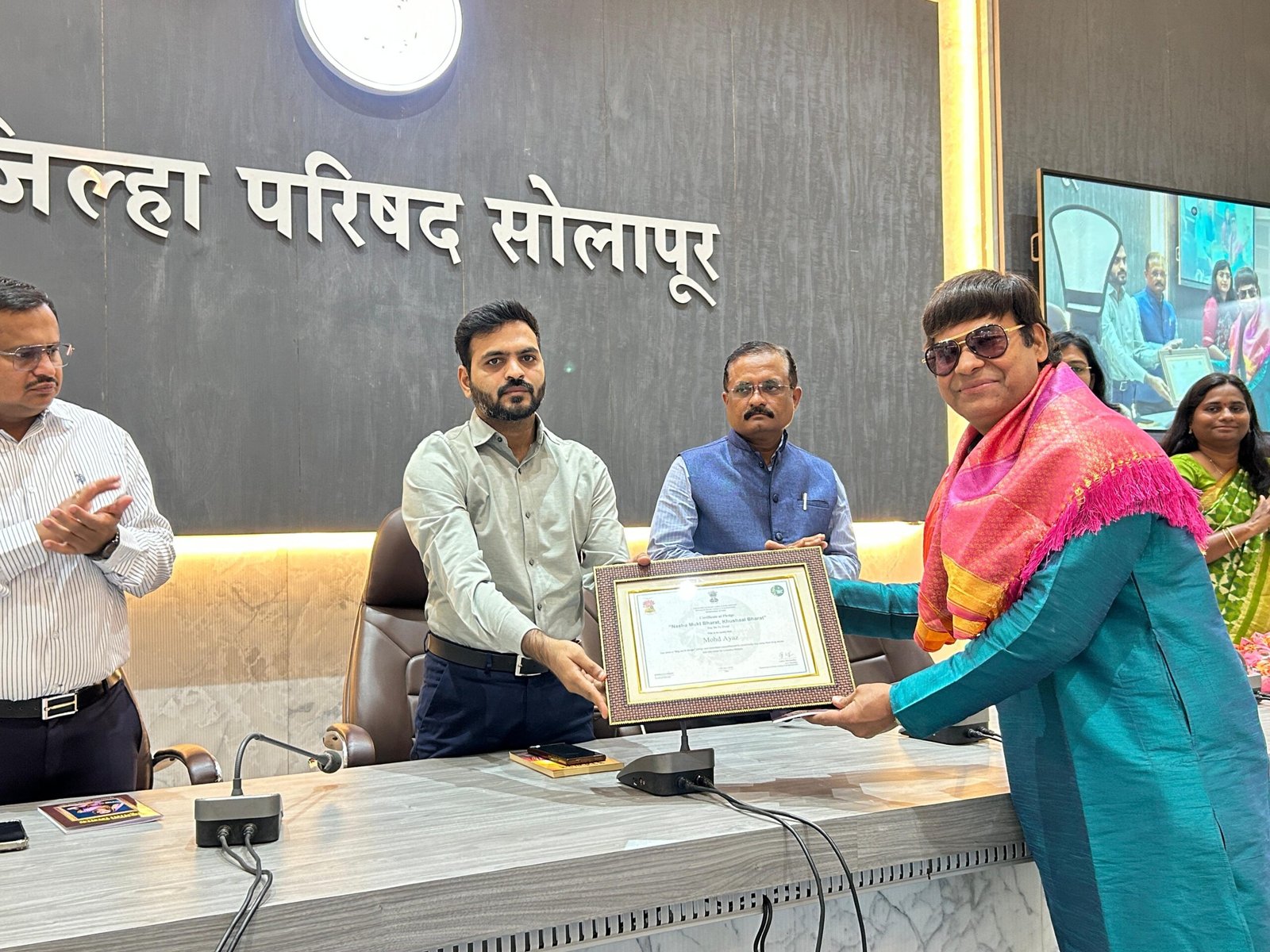 फोटोमध्ये = जिल्हा परिषद सोलापूरचे मुख्य कार्यकारी अधिकारी श्री कुलदीप जंगम, अतिरिक्त मुख्य कार्यकारी अधिकारी संदिप कोहिनकर, संचालक प्रकल्प सोलापूर जिल्हा ग्रामीणचे अधिकारी राजशेखर जगताप, गायक मोहम्मद अयाज
