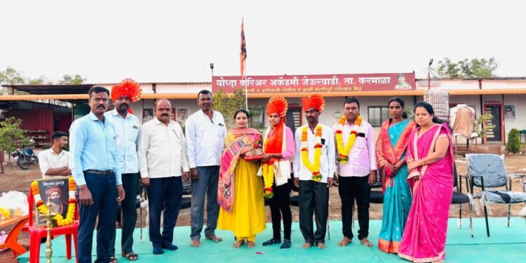 जेऊर – जेऊरवाडी ता करमाळा येथे केंद्रीय निवड मंडळाकडून  घेण्यात पोलिस भरती परिक्षेत यशस्वी झालेल्या योद्धा करिअर अकॅडमी मधील तीन विद्यार्थ्यांचा सन्मान करण्यात आला. हा सन्मान पोलीस उपनिरीक्षक सारिका मारकड यांच्या हस्ते करण्यात आला.