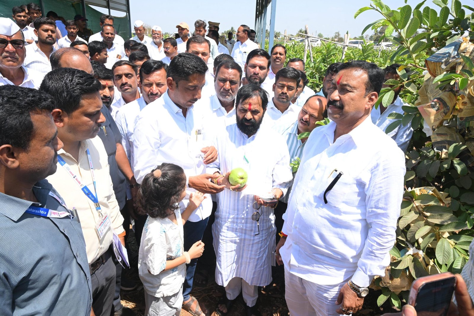 यावेळी उत्पादन मंत्री श्री. गोगावले यांनी शेतकरी संतोष पाटील (डाळिंब), संजय पाटील (आंबा), ऋषिकेश पाटील (डाळिंब), मनोज काळे (पेरू) व भागवत काळे (केळी) यांच्याशी चर्चा करून रोपे खरेदी, खत-औषध फवारणी, उत्पादनानंतर व्यापाऱ्यांकडून होणारी पिळवणूक, बाजारभावातील चढ-उतार व हवामानातील बदल अशा अडचणी जाणून घेतल्या. तसेच फळबाग लागवडीसाठी मिळणाऱ्या शासकीय योजना व अनुदानाबाबतही चर्चा करण्यात आली.