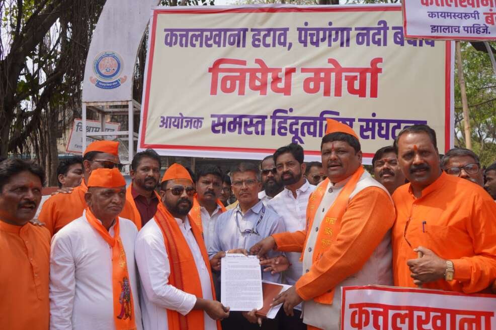 इचलकरंजी शहरातील ‘इचलकरंजी अॅग्रो फूडस् अॅण्ड ग्यामा एन्टरप्रायझेस’ या कंपनीकडून प्राण्यांच्या कातड्यावर प्रक्रिया केलेले, तसेच कत्तलखान्याचे रक्त आणि मांसमिश्रीत सांडपाणी विनाप्रक्रिया ओढ्यात सोडले जाते. हे पाणी पंचगंगा नदीत मिसळते. या पाण्यात विषारी घटक असल्यानेे नागरिकांना आरोग्याच्या समस्या भेडसावत आहेत, तसेच नागरिकांना त्वचेचे विकारही होत आहेत. हेच पाणी पुढे कृष्णा नदीत मिसळून तीर्थक्षेत्र असलेल्या नृसिंहवाडी येथे जात असल्याने भाविकांच्या धार्मिक भावना दुखावत आहेत. या संदर्भात प्रदूषण मंडळ आणि महापालिका प्रशासन कोणतीच कारवाई करत नाही. तरी ‘इचलकरंजी अॅग्रो फूडस् अॅण्ड ग्यामा एन्टरप्रायझेस’ हा कत्तलखाना कायमस्वरूपी बंद करावा, या मागणीसाठी 500 हून अधिक हिंदुत्वनिष्ठ, शिवभक्त यांनी प्रांत कार्यालयावर मोर्चा काढला. या प्रसंगी पंचगंगेचे प्रदूषण करणारा कत्तलखाना 15 दिवसांत बंद झालाच पाहिजे; अन्यथा नागरिक तो बंद पाडतील, अशी चेतावणी *‘कत्तलखाना हटाव-पंचगंगा बचाव’* मोर्चाद्वारे देण्यात आली. मोर्चाच्या अंती नायब तहसीलदार संजय काटकर यांनी निवेदन स्वीकारले आणि या मागण्या वरिष्ठांच्या कानावर घालू असे आश्वासन त्यांनी दिले.