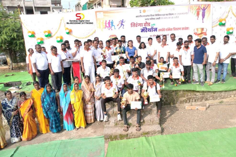 उमरी ( प्रतिनिधी ) उमरी नगर परिषदेच्या वतिने भारतीय स्वातंत्र्य दिना निमित्त व हर घर तिरंगा या उपक्रमांतर्गत भव्य तिरंगा दौड मॅरेथॉन स्पर्धा संपन्न झाली त्या मध्ये प्रथम बक्षीस माधव मैनतकर यांनी मिळवीले तर व्दितीय बक्षीस शंकर इंगोले आणि तृतीय बक्षीस सुर्यकांत गोबलवाड यांनी मान मिळवला आहे तर मुलिमध्ये शिवकुमारी पुदलवाड ह्या प्रथम तर व्दितीय वैष्णवी कस्तुरे आणि वैष्णवी मदनवाड यांनी मान पटकाविला आहे