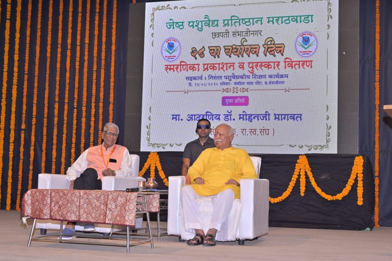 तभा फ्लॅश न्यूज/छत्रपती संभाजीनगर : भारतीय शेतीत आधुनिक तंत्रज्ञानाचा योग्य वापर करून तसेच पशुपालनासह मिश्र शेतीचा अवलंब केल्यास शेतकऱ्यांना अधिक फायदा होईल. जागतिक पातळीवरील अनिश्चितता आणि आव्हानांचा विचार करता कृषी क्षेत्रात स्वयंपूर्ण होणे अत्यावश्यक आहे, असे प्रतिपादन राष्ट्रीय स्वयंसेवक संघाचे सरसंघचालक डॉ. मोहन भागवत यांनी केले. ज्येष्ठ पशुवैद्य प्रतिष्ठानच्या २८ व्या वर्धापन दिनानिमित्त छत्रपती संभाजीनगर येथील तापडिया नाट्य मंदिरात आयोजित कार्यक्रमात ते बोलत होते.