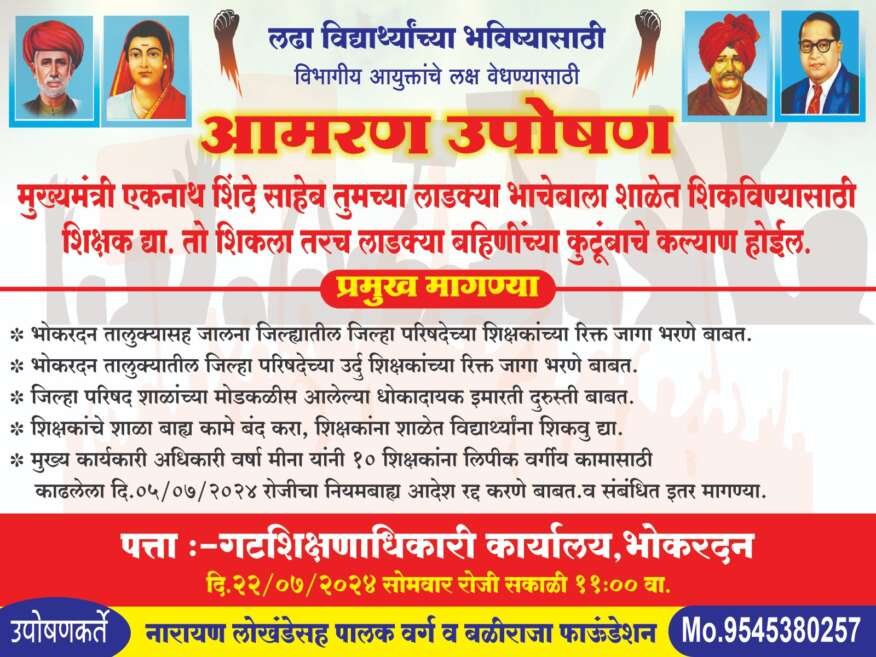 धोकादायक बनलेल्या जिल्हा परिषद शाळांची दुरुस्ती करणे. मंजूर शाळांचे बांधकाम सुरु करणे.आदी मागण्यांसाठी 22 जुलै सोमवार रोजी पासून आमरण उपोषणास सुरुवात होत आहे.पालकांनी विध्यार्थ्यांच्या उज्वल भविष्यासाठी एकत्र येऊन जिल्हा परिषद शाळा वाचविण्यासाठी आंदोलनात सहभागी व्हावे असे आवाहन नारायण लोखंडे यांनी केले.