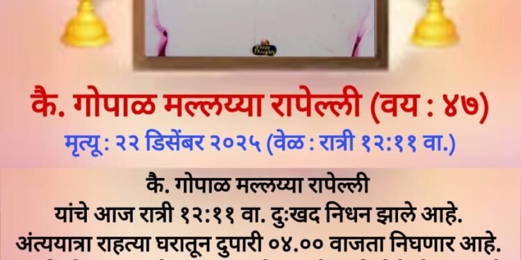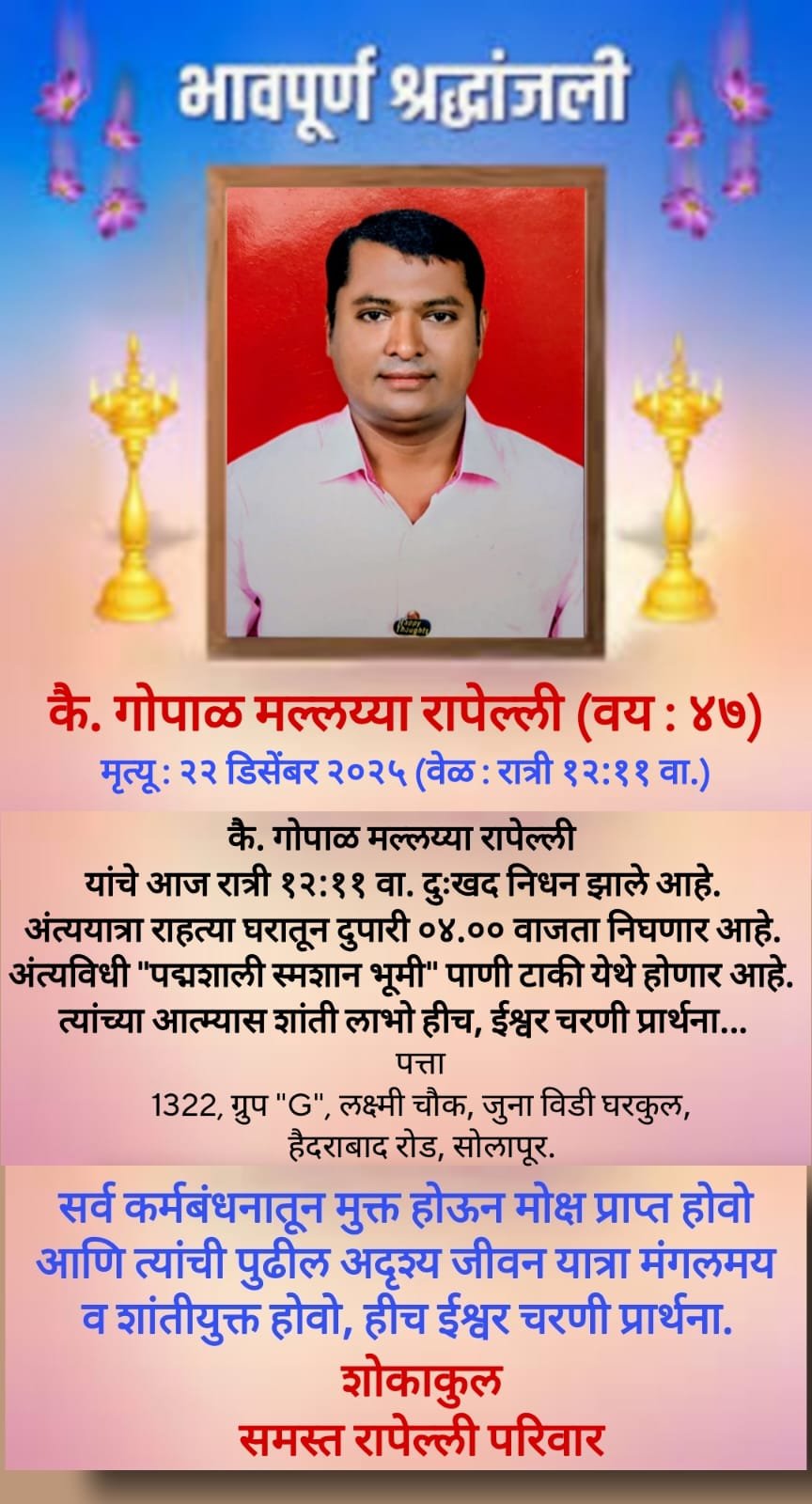 सोलापूर – कै. गोपाळ मल्लय्या रापेल्ली वय 47 यांचे दिनांक 22 डिसेंबर 2025 रोजी रात्री बारा वाजता निधन झाले. त्यांची अंत्ययात्रा दुपारी चार वाजता निघणार असून अंत्यविधीही पद्मशाली स्मशानभूमी पाणी टाकी होते होणार आहे.