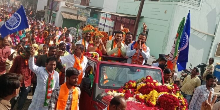 सोलापूर – महानगरपालिका निवडणुकीत प्रभाग क्रमांक २२ मध्ये भारतीय जनता पार्टीचे अधिकृत उमेदवार किसन जाधव, दत्तात्रय नडगिरी, अंबिका नागेश गायकवाड व चैत्राली गायकवाड यांच्या प्रचारार्थ काढलेल्या भव्य रोडशो म्हणजे जणू विजयाचा गुलाल उधळणारी विजयदर्शी पदयात्राच ठरली. रामवाडी शासकीय गोदामापासून सोनी नगर, रेवणसिद्धेश्वर नगर, विजापूर नाका मार्गे रामवाडी मुख्य रस्त्यापर्यंत निघालेल्या या पदयात्रेत हजारो महिलांनी हातात भाजपचे झेंडे घेऊन उत्स्फूर्त सहभाग नोंदवला आणि अवघा परिसर भगवामय झाला.
