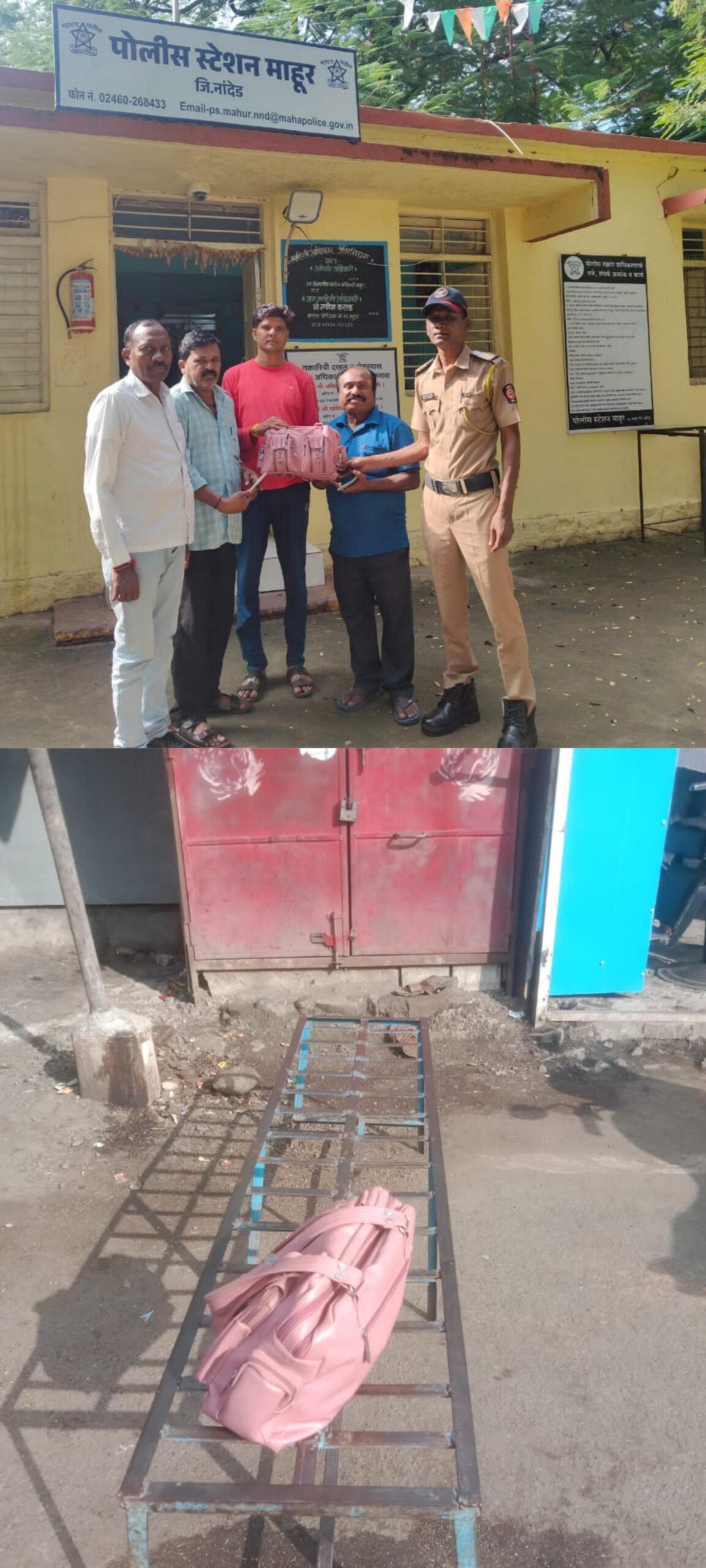 दरम्यान,वाई बाजार येथे माहेरी गेल्यावर गीताताई यांनी आपली बॅग हरवल्याचे अर्थात माहूर येथे सदरील दुकानाच्या बाकड्यावर विसरल्या चे लक्षात आले. त्यांचे नातेवाईक पतीराज कैलास राठोड व भाऊ मिथुन जाधव यांनी माहिती मिळाल्याप्रमाने माहूर पोलीस ठाणे गाठले व हरवलेल्या बॅगेसंदर्भात सविस्तर माहिती दिली, असता पोना प्रकाश गेडाम, हेअर ड्रेसर प्रदीप शेरकुरवार यांनी सदरील बॅग त्यांच्या सुपुर्द केली.