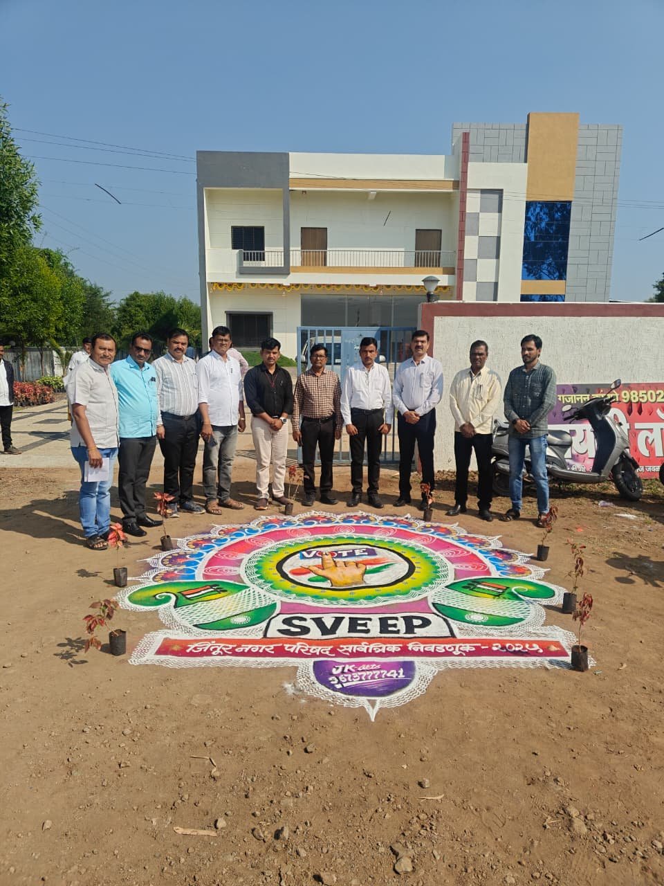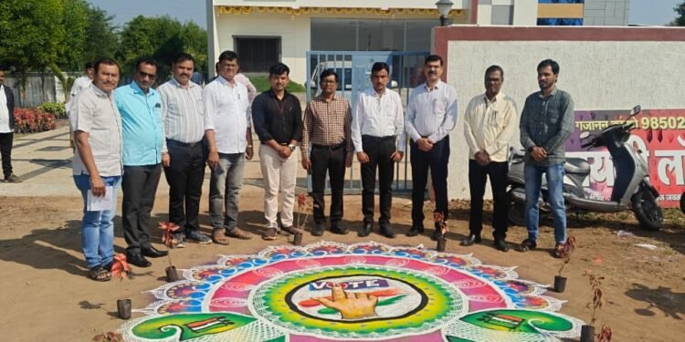 जिंतूर / परभणी – दिनांक 21 नोव्हेंबर जिंतूर नगरपरिषद सार्वत्रिक निवडणूक 2025 मतदान जनजागृती अभियान अंतर्गत निवडणूक कार्यासाठी नेमलेल्या कर्मचारी मतदारांना जागृत करण्यासाठी मतदान जनजागृतीसाठी जिल्हा परिषद प्रशाला कौसडी या ठिकाणी कार्यरत असणाऱ्या कला शिक्षक ज्ञानेश्वर बर्वे यांनी भव्य व आकर्षक रांगोळी काढली. या रांगोळीच्या माध्यमातून उपस्थित असणाऱ्या सर्व मतदारांना आपल्या मतदानाचा हक्क समजावून देण्याचा प्रयत्न करण्यात आला. उपस्थित सर्वांनी सदर कलाकृतीचे विशेष कौतुक केले.