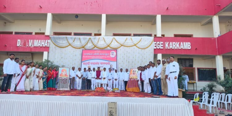 करकंब : दयानंद शिक्षण संस्था नवी दिल्ली अध्यक्ष पद्मश्री पुनम सुरी यांच्या मार्गदर्शनाखाली संपूर्ण भारत व भारताबाहेर असणाऱ्या सुमारे ३हजार शाळा कॉलेजमधून १२ फेब्रुवारी रोजी महर्षी दयानंद सरस्वती यांच्या २९२व्या जयंती निमित्त विविध कार्यक्रम आयोजित करण्यात आले होते.त्या अनुषंगाने रामभाऊ जोशी हायस्कूल व डी.ए.व्ही महात्मा आनंद स्वामी सरस्वती ज्यु.काॅलेज करकंब येथे दयानंद शिक्षण संस्था सोलापूर यांचे स्थानिय सचिव महेश चौप्रा व प्रशासक डॉ.विजयकुमार उबाळे यांच्या मार्गदर्शनाखाली “महर्षी दयानंद सरस्वती जन्मोत्सव” व २९२व्या जयंती निमित्त भव्य जन्मोत्सव स्मरणोत्सव कार्यक्रमांतर्गत जगाच्या कल्याणासाठी “महर्षी दयानंद प्रशंसन यज्ञ” व “होम हवन” करण्यात आले.