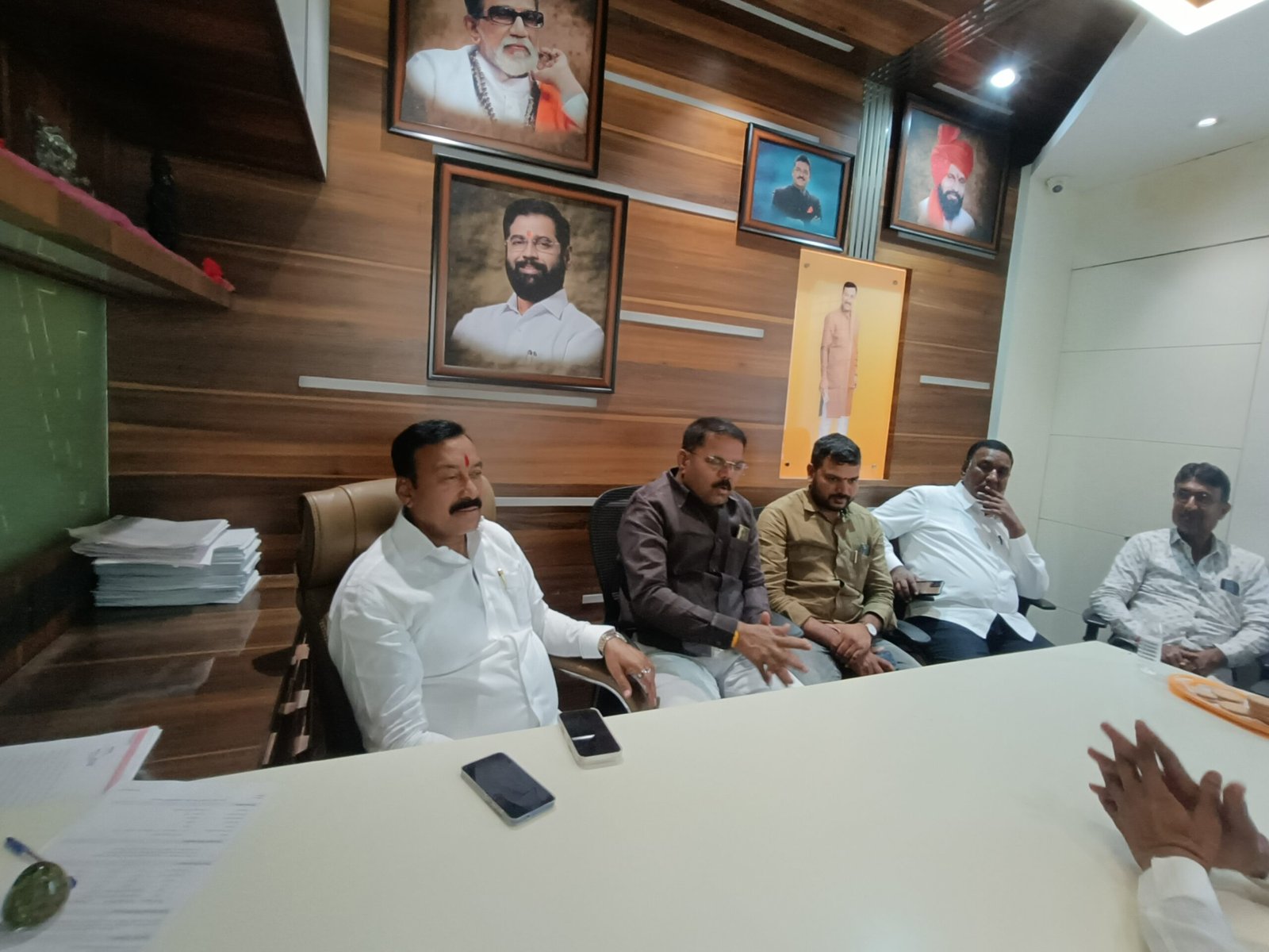 टेंभुर्णी: ना. भरतशेठ गोगवले यांच्या दौऱ्याविषयी माहिती देताना संजय कोकाटे, पोपट अनपट, संतोष पाटील, वैभव कुटे आदी मान्यवर.