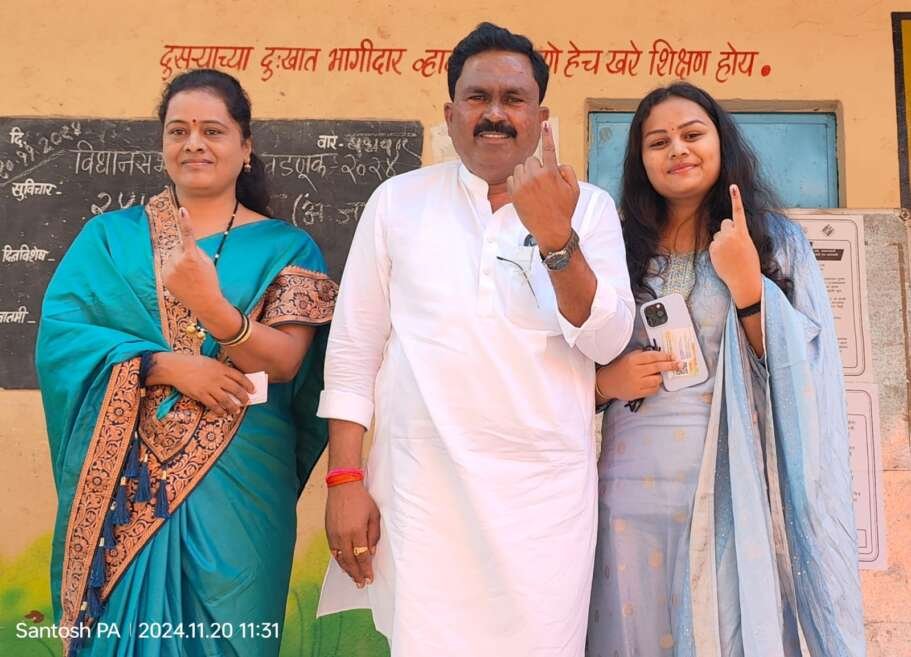 मौजे मुंढेवाडी(ता.मोहोळ) येथे महायुतीचे अधिकृत उमेदवार आमदार श्री.यशवंत(तात्या)माने * यांनी पत्नी सौ. नीता आणि कन्या निकिता सहकुंटुंब समवेत मतदानाचा हक्क बजावला.*