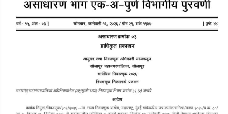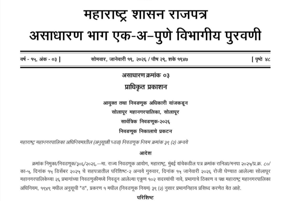 प्राधिकृत प्रकाशन करण्यात आले आहे. आयुक्त तथा निवडणूक अधिकारी डॉ. सचिन ओम्बासे यांनी या निवडणूक निकालाचे प्रकटन केले आहे. गुरुवार, दि. १५ जानेवारी २०२६ रोजी घेण्यात आलेल्या सोलापूर महानगरपालिकेच्या २६ प्रभागांच्या निवडणुकीमध्ये निवडून आलेल्या एकूण १०२ सदस्यांची नावे, प्रभागाचे ठिकाण व पक्ष महाराष्ट्र महानगरपालिका अधिनियम, १९४९ मधील अनुसूची “ड”, प्रकरण १ मधील (निवडणूक नियम) ३९ (२) नुसार प्रभागनिहाय प्रसिध्द करण्यात आले आहे.
