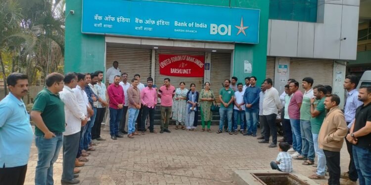बार्शी – पाच दिवसांचा आठवडा या करारानुसार मान्य केलेल्या मागणीची त्वरित अंमलबजावणी करण्यात यावी, या दीर्घकालीन प्रलंबित मागणीसाठी आज बँकिंग क्षेत्रातील UFBU या शिखर संघटनेंतर्गत नऊ संघटनानी देशव्यापी संप पुकारला होता.