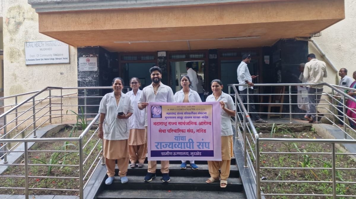 तभा फ्लॅश न्यूज/मुदखेड: महाराष्ट्र राज्य परिचारिका संघटना मुख्यालय लातूर संलग्न शाखा नांदेड, महाराष्ट्र राज्य सार्वजनिक आरोग्य सेवा परिचारिका संघटनेच्या वतीने  मुदखेड ग्रामिण रुग्णालय येथील परिचारिकांनी राज्यव्यापी संप केला.