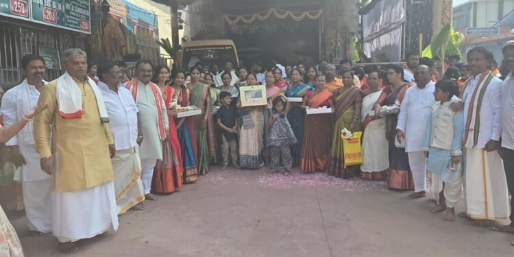 सोलापूर : तिरुपतीनजीकच्या तिरुचानूर येथील श्री पद्मावतीदेवीला सोलापूरच्या पद्मशाली समाजातील 25 जोडप्यांनी प्रत्येकी एक याप्रमाणे एकूण 25 तसेच समाजबांधवांतर्फे सामूहिक ‘पुट्टींटी पट्टूचिरा’ अर्थात माहेरची साडी अर्पण करण्यात आली.तिरुचानूर येथील श्री पद्मावतीदेवी मंदिरात सध्या ब्रह्मोत्सव सुरू आहे.