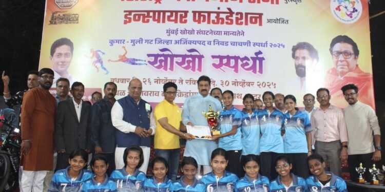 मुंबई – मुंबई खो-खो संघटनेच्या मान्यतेने इन्स्पायर फाऊंडेशन आयोजित आणि महाराष्ट्र नवनिर्माण सेना (मनसे) पुरस्कृत कुमार–मुली (ज्युनिअर) मुंबई जिल्हा अजिंक्यपद व निवड चाचणी खो-खो स्पर्धा केशवराव दाते क्रीडांगण, आगाशे पथ, दादर (प.) येथे अत्यंत थरारक आणि रोमहर्षक लढतींच्या साक्षीने या स्पर्धेचा समारोप झाला. दोन्ही गटात ओम साईश्वर सेवा मंडळाने पहिल्यांदाच दुहेरी मुकुट पटकावत इतिहास रचला. अंतिम फेरीच्या थरारक व धमाकेदार सामन्यांमुळे प्रेक्षकांनी रोमांच अनुभवला. कुमार-मुली दोन्ही गटात ओम साईश्वर सेवा मंडळाने पहिल्यांदाच दुहेरी मुकुट मिळवत व शानदार विजय साजरे करत जिल्हा अजिंक्यपदावर सुवर्णाक्षरात नाव कोरले. ओम साईश्वर सेवा मंडळाचे हे मुलींचे तिसरे तर कुमारांचे पहिले अजिंक्यपद ठरले. यापूर्वी कुमारांमध्ये दोनवेळा त्यांना उपअजिंक्यपदावर समाधान मानावे लागले होते.