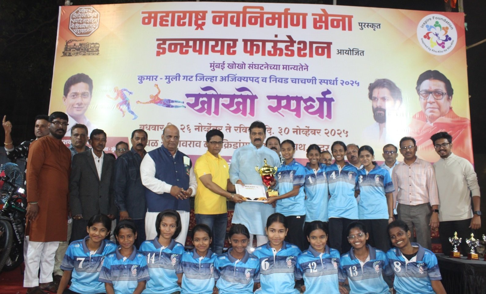 मुंबई – मुंबई खो-खो संघटनेच्या मान्यतेने इन्स्पायर फाऊंडेशन आयोजित आणि महाराष्ट्र नवनिर्माण सेना (मनसे) पुरस्कृत कुमार–मुली (ज्युनिअर) मुंबई जिल्हा अजिंक्यपद व निवड चाचणी खो-खो स्पर्धा केशवराव दाते क्रीडांगण, आगाशे पथ, दादर (प.) येथे अत्यंत थरारक आणि रोमहर्षक लढतींच्या साक्षीने या स्पर्धेचा समारोप झाला. दोन्ही गटात ओम साईश्वर सेवा मंडळाने पहिल्यांदाच दुहेरी मुकुट पटकावत इतिहास रचला. अंतिम फेरीच्या थरारक व धमाकेदार सामन्यांमुळे प्रेक्षकांनी रोमांच अनुभवला. कुमार-मुली दोन्ही गटात ओम साईश्वर सेवा मंडळाने पहिल्यांदाच दुहेरी मुकुट मिळवत व शानदार विजय साजरे करत जिल्हा अजिंक्यपदावर सुवर्णाक्षरात नाव कोरले. ओम साईश्वर सेवा मंडळाचे हे मुलींचे तिसरे तर कुमारांचे पहिले अजिंक्यपद ठरले. यापूर्वी कुमारांमध्ये दोनवेळा त्यांना उपअजिंक्यपदावर समाधान मानावे लागले होते.