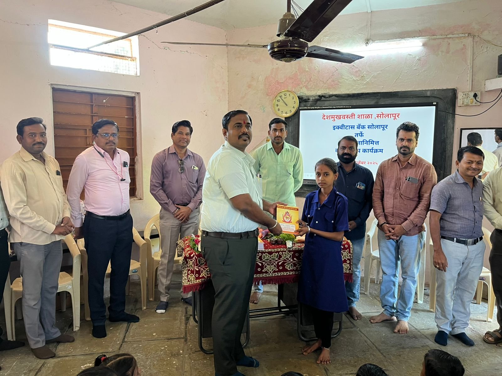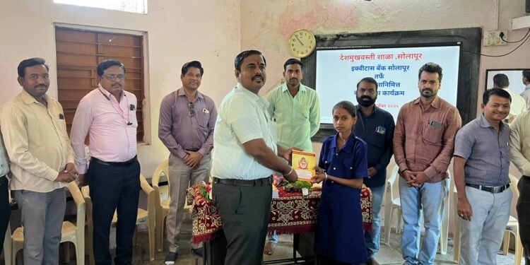 सोलापूर : कै. गंगाराम देशमुख मनपा देशमुख वस्ती शाळेत बाल दिनानिमित्त शाळेतील इयत्ता पहिली ते सातवीच्या 120 विद्यार्थ्यांना इक्विटस बँकेचे डिव्हिजन मॅनेजर अरुण शिंदे व शाळा व्यवस्थापन समितीचे अध्यक्ष बबन ऐवळे यांच्या हस्ते वह्या वाटप करण्यात आले.