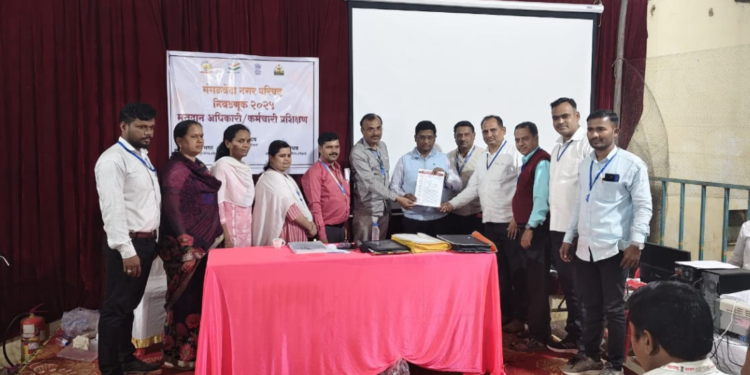 मंगळवेढा तहसिल कार्यालयातील सामुहिक रजेबाबत निवेदन तहसिलदार मदन जाधव यांना देताना कर्मचारी छायाचित्रात दिसत आहेत.