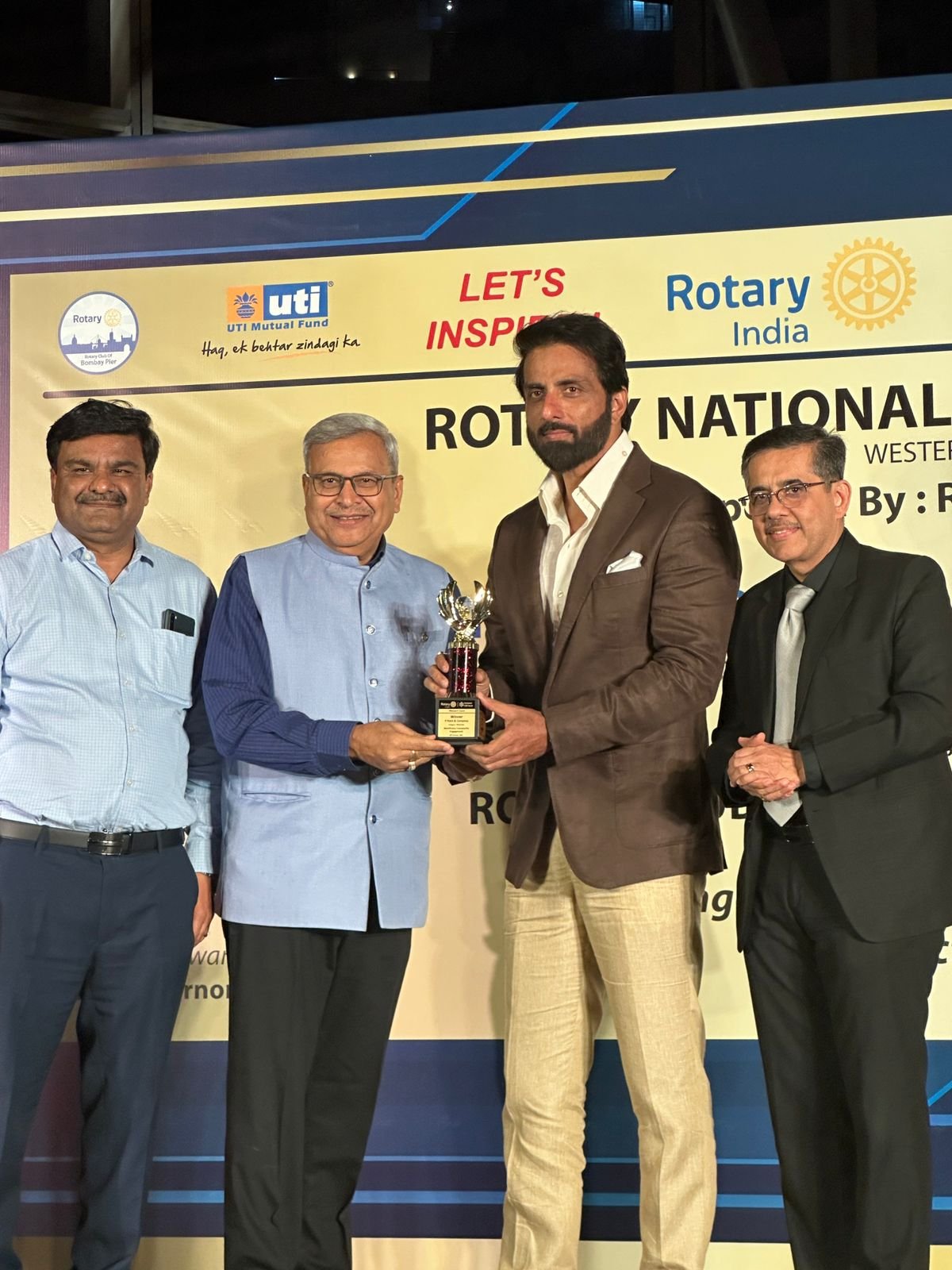 photo lines – रोटरी इंडिया नॅशनल सीएसआर अवॉर्ड २०२५’ – अभिनेता सोनू सूद त्यांच्या हस्ते स्वीकारताना पी. पी. पटेल अँड कंपनीचे जयेश पटेल, शेजारी सुनील माहेश्वरी व मोतीलाल ओसवाल