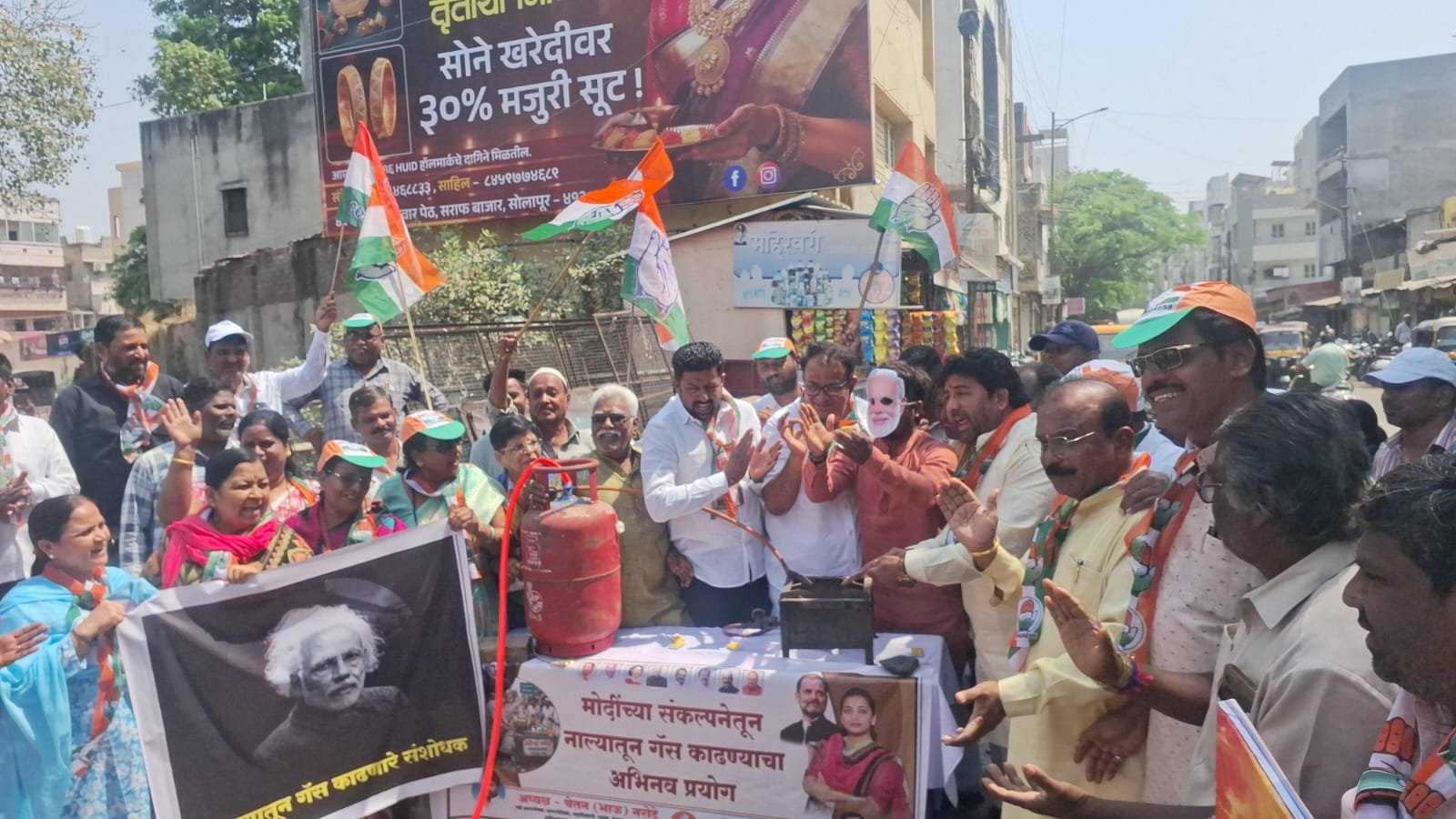 या पार्श्वभूमीवर, कुंभार वेस नाल्याजवळ, सोलापूर शहर काँग्रेस पक्षाचे अध्यक्ष चेतन नरोटे यांच्या नेतृत्वाखाली पंतप्रधान नरेंद्र मोदी यांनी मांडलेल्या ‘नाल्यातून गॅस काढण्याच्या’ संकल्पनेचा संदर्भ घेत, काँग्रेस कार्यकर्त्यांनी प्रत्यक्ष नाल्यातून गॅस तयार करण्याचा अभिनव प्रयोग करून सरकारच्या धोरणांचा निषेध नोंदविला. या प्रयोगाद्वारे सत्ताधाऱ्यांच्या दाव्यांची खिल्ली उडवत जनतेच्या समस्यांकडे लक्ष वेधण्याचा प्रयत्न करण्यात आला.यावेळी कार्यकर्त्यांनी नरेंद्र मोदी यांच्या प्रतिमेसमोर हे मोदी बाबा, हे मोदी बाबा, मेरी लाज रख लो आज, नाले से गॅस निकालो आज, चाय पकोडे बनालो आज, अशी आरती केली आणि नाले का गॅस का सपना दिखाना बंद करो, गॅस सिलेंडर सस्ता करो असे म्हणत गॅस पुरवठा सुरळीत करण्याची मागणी केली.