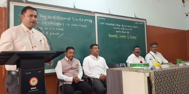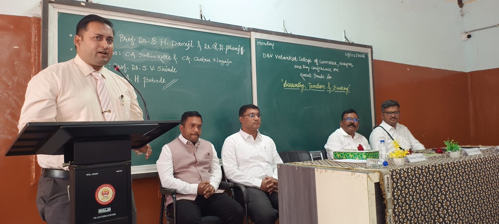 सोलापूर : डीएव्ही वेलणकर वाणिज्य महाविद्यालय, सोलापूर येथे दिनांक ९ फेब्रुवारी २०२६ रोजी “रिसेंट ट्रेंड्स इन अकाउंटिंग, टॅक्सेशन अँड बँकिंग” या अत्यंत महत्त्वपूर्ण व अभ्यासपूर्ण विषयावर एक दिवसीय परिषदेचे यशस्वी आयोजन करण्यात आले. बदलत्या आर्थिक, कर व बँकिंग व्यवस्थेच्या पार्श्वभूमीवर विद्यार्थ्यांना अद्ययावत ज्ञान मिळावे, या उद्देशाने या परिषदेचे आयोजन करण्यात आले होते.