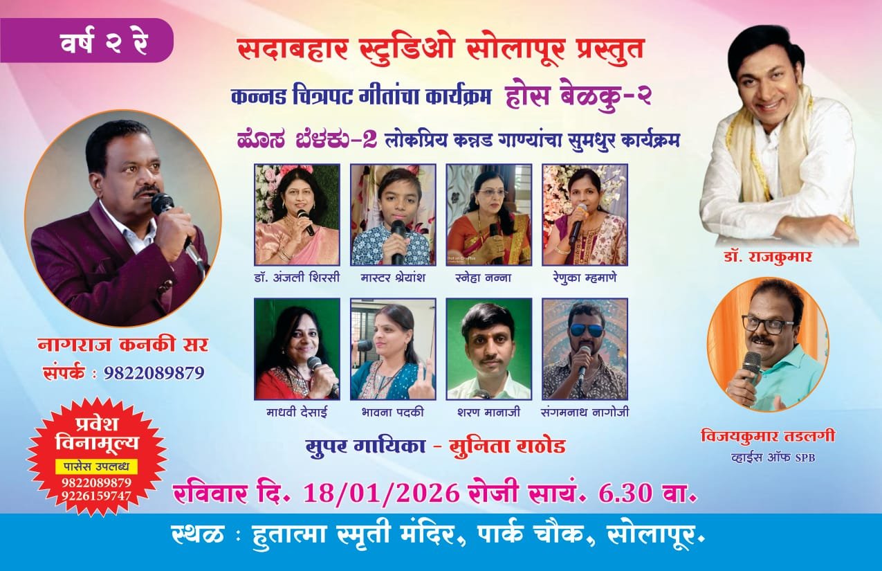 सोलापूर –  येथील खास कन्नड़ रसिकासाठी. श्री. सिद्धरामेश्वर यात्रा निमीत्त सदाबहार स्टुडिओ प्रस्तुत “होस बेळकु-२” हा लोकप्रिय कन्नड चित्रपट गीताचा मराठी भाषिक कन्नड अभिमानी गायक व गायिकाकडून गीताचे सुमधुर कार्यक्रम रविवार दिनांक १८/०१/२०२६ रोजी हुतात्मा स्मृती मंदीर, सोलापूर येथे सायंकाळी ठिकः-०६.३० वा आयोजित करण्यात आले आहे.