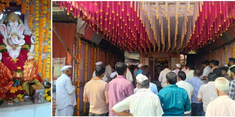संग्राम दोस्ती मंडळ गणेश मंदिरात भजन व आरती करताना मंडळाचे पदाधिकारी भजनी मंडळ व भक्तगण व नागरिक
