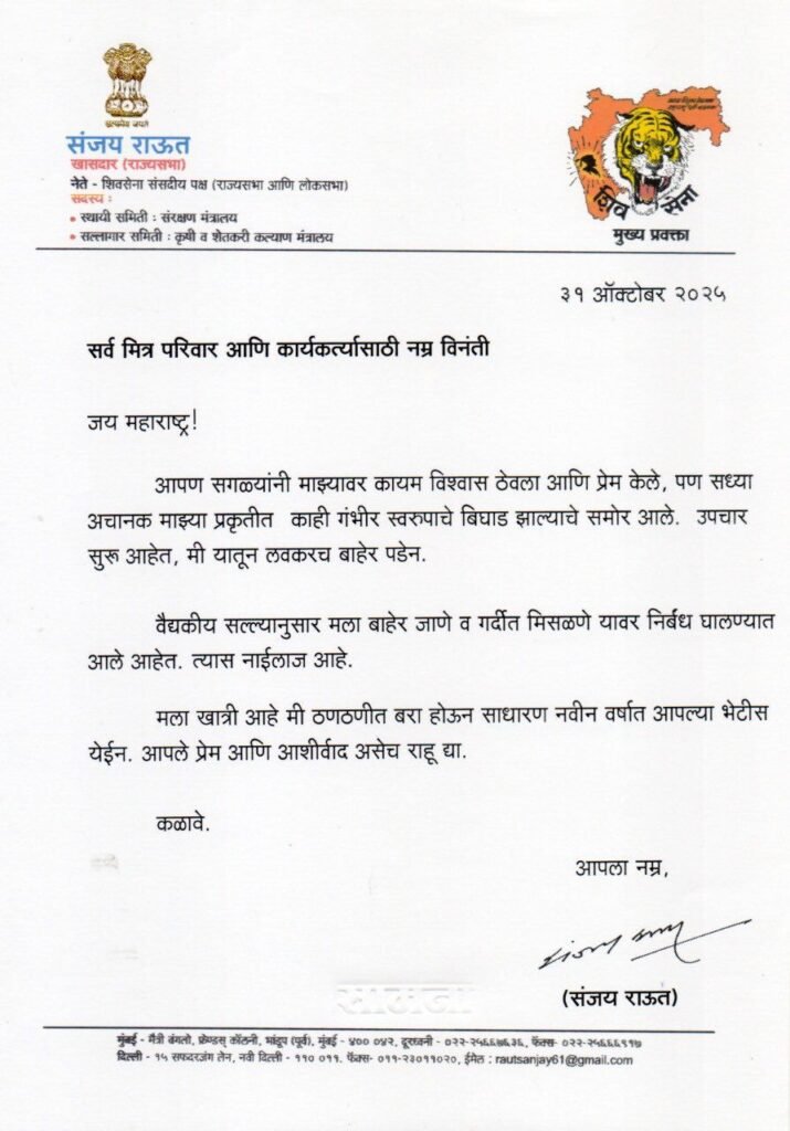 संजय राऊत यांनी काही वेळापूर्वी ट्विटर हँडलवरून कार्यकर्त्यांसाठी पत्रक प्रसिद्ध केलं. या पत्रात त्यांनी प्रकृतीत बिघाड झाल्याची माहिती दिली. तसेच २ महिन्यांसाठी सार्वजनिक आयुष्यातून दूर राहणार असल्याची माहिती दिली.
