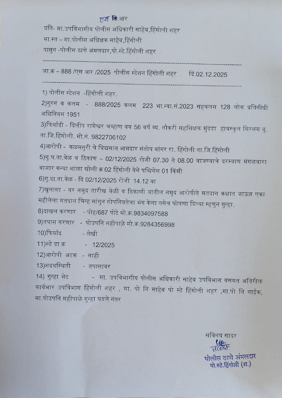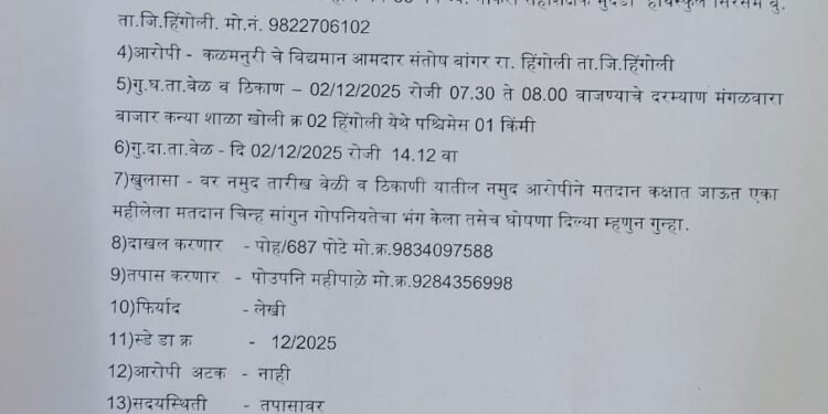 हिंगोली – नगर परिषद निवणुकीसाठी मंगळवारी शहरात मतदान सुरू असताना कन्या शाळेतील मतदान केंद्रातील खोली क्रमांक 2 मध्ये मतदान कक्षात जाऊन महिलेला मतदान चिन्ह सांगून गोपनीयतेच भंग केला तसेच घोषणा दिल्यामुळे केंद्राध्यक्ष यांच्या तक्रारीवरून गुन्हा दाखल करण्यात आला आहे.