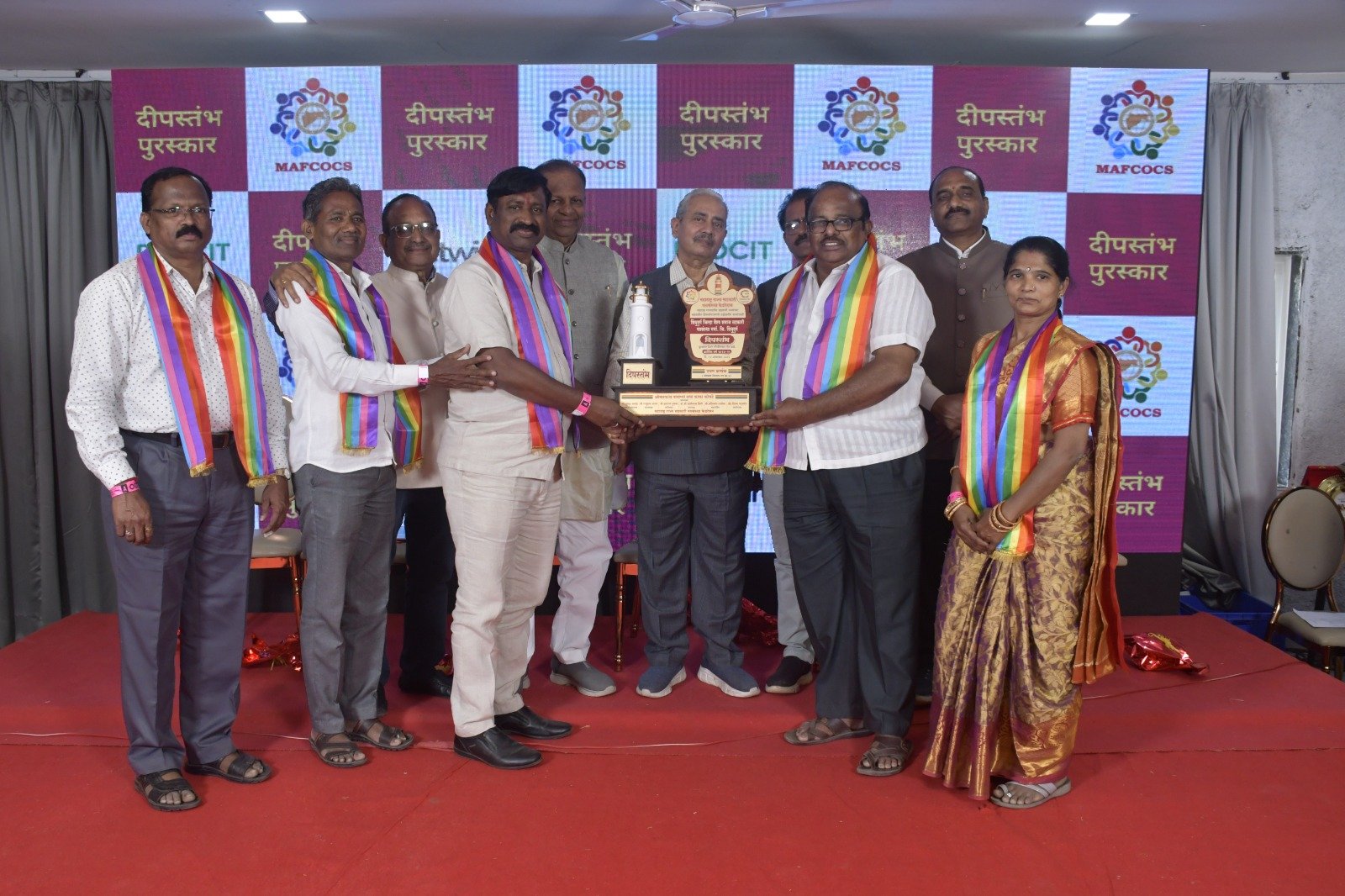फोटो ओळी – पुणे भोर येथे संपन्न झालेल्या महाराष्ट्र राज्य सहकारी पतसंस्था फेडरेशन च्या वतीने राज्यस्तरीय प्रथम दीपस्तंभ पुरस्कार स्वीकारताना संस्थेचे चेअरमन लक्ष्मीकांत रामचंद्र उदगिरी संचालक अरुण चिंता, अंबिका उदगिरी, शंकर कोंतम व्यवस्थापक राजेंद्र उदगिरी उपस्थित होते.