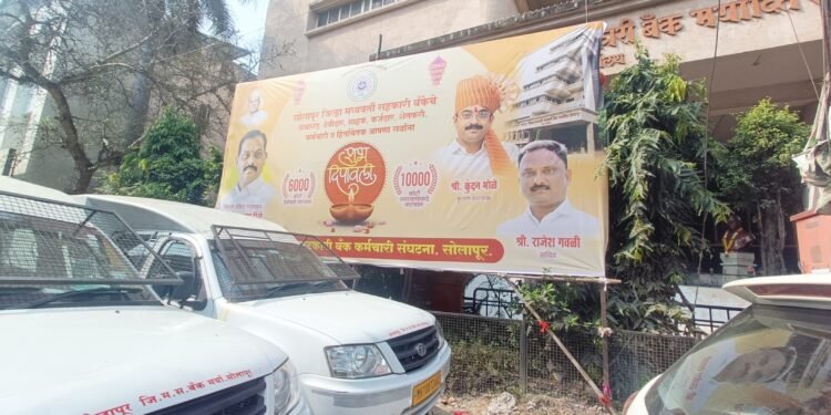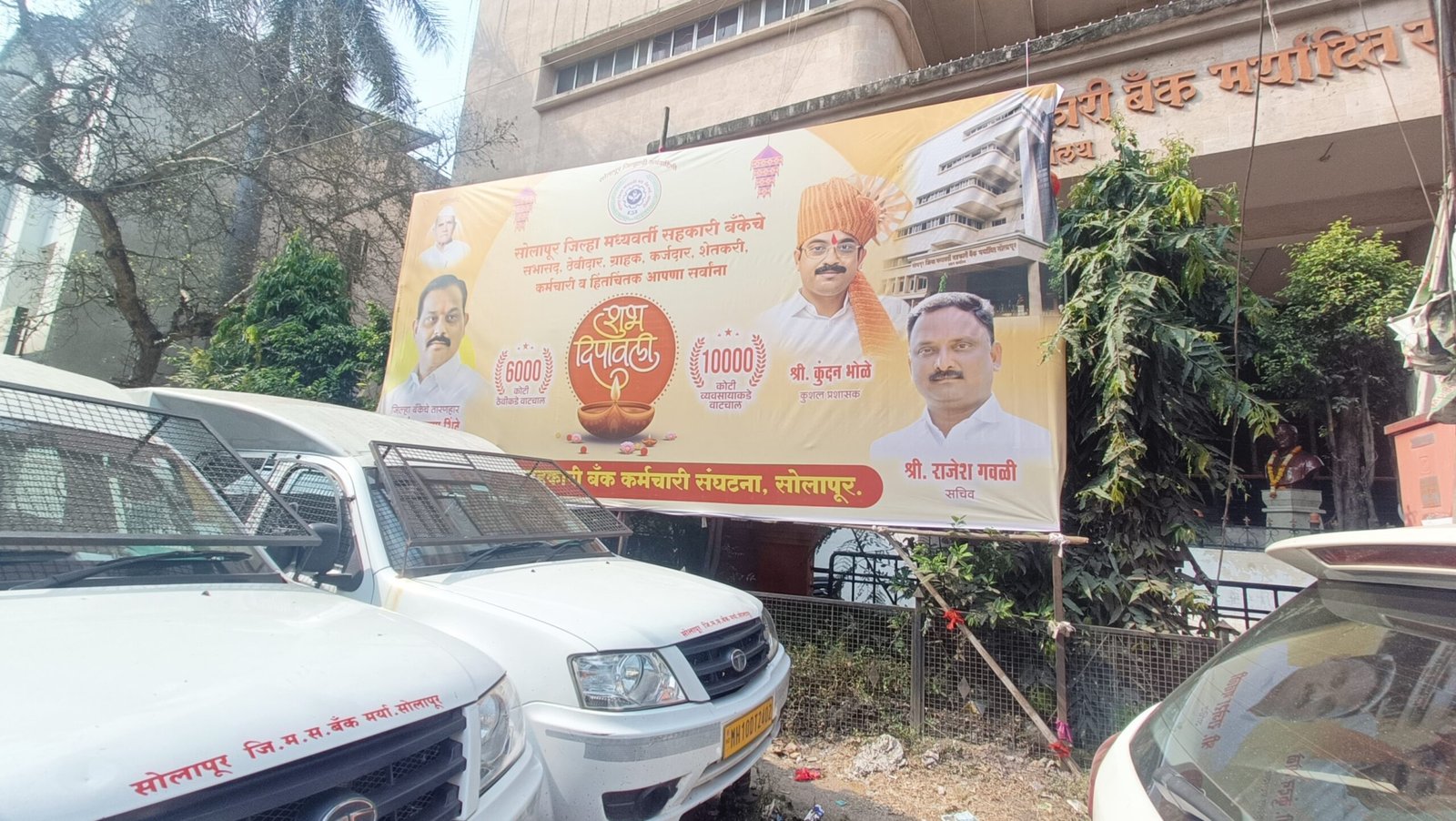 सोलापूर जिल्हा मध्यवर्ती सहकारी बँकेच्या सभासद, ठेवीदार, कर्जदार, शेतकरी, पदाधिकारी आणि कर्मचारी यांना दीपावलीच्या शुभेच्छा देण्यासाठी सोलापूर जिल्हा मध्यवर्ती सहकारी बँक मुख्य प्रशासकीय इमारतीसमोर बँकेचे प्रशासक अध्यक्ष आणि सचिव यांचे बॅनर झळकल्याचे दिसत आहे.