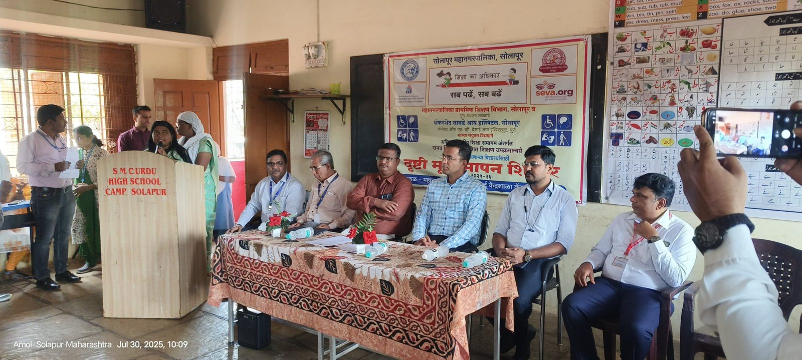 या कार्यक्रमाला मा. आयुक्त डॉ. सचिन ओम्बासे प्रमुख पाहुणे म्हणून उपस्थित होते. कार्यक्रमाचे प्रास्ताविक उपायुक्त श्री. तैमूर मुलाणी यांनी केले. कार्यक्रमास प्राथमिक शिक्षण मंडळाचे प्रशासन अधिकारी श्री. विठ्ठल ढेपे, सहाय्यक आयुक्त श्री. गिरीश पंडित, एच. व्ही. देसाई हॉस्पिटलचे असोसिएट डायरेक्टर डॉ. सुधीर सुदाल, तसेच शासकीय वैद्यकीय महाविद्यालय, सोलापूर येथील डॉ. निलेश बागुल आणि नेत्ररोग विभागातील तज्ज्ञ उपस्थित होते.