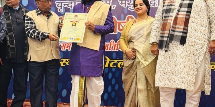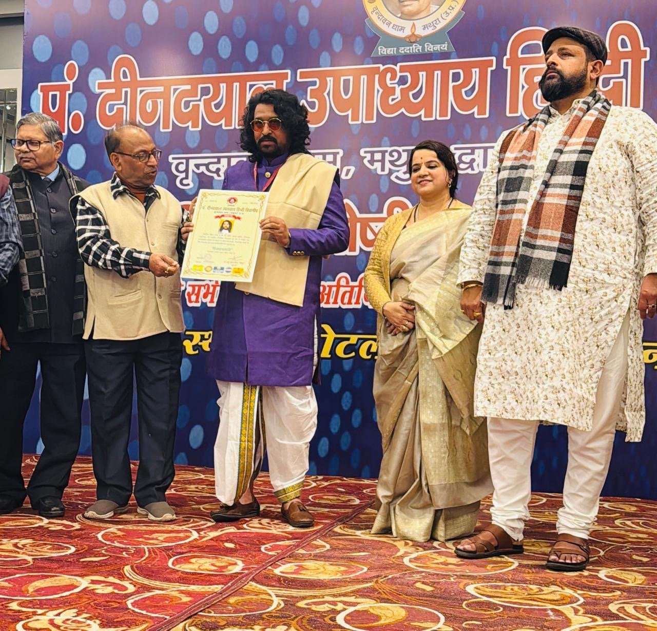 सोलापूर : शहरातील प्रसिद्ध चित्रकार सचिन खरात यांचा भारतीय चित्रशैली योगदानाबद्दल मथुरा (उत्तर प्रदेश) येथील पंडित दीनदयाल उपाध्याय हिंदी विद्यापीठाकडून नुकताच नवी दिल्ली येथे गौरव करण्यात आला. नवी दिल्लीच्या हॉटेल रेडिसन ब्ल्यू मध्ये झालेल्या कार्यक्रमात कुलपती अरविंद कुमार ठाणे इंद्र भूषण मिश्रा यांच्या हस्ते पुरस्कार देऊन गौरवण्यात आले.