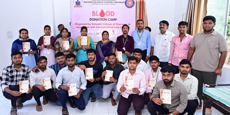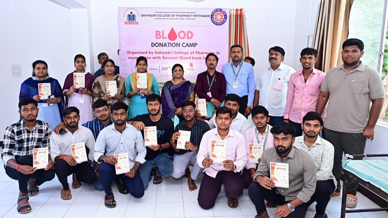 सांगोला – सह्याद्री कॉलेज ऑफ फार्मसी, मेथवडे (ता.सांगोला) येथे रक्तदान शिबिराचे आयोजन करण्यात आले होते. त्यास विद्यार्थ्यांचा उत्स्फूर्त प्रतिसाद लाभला.