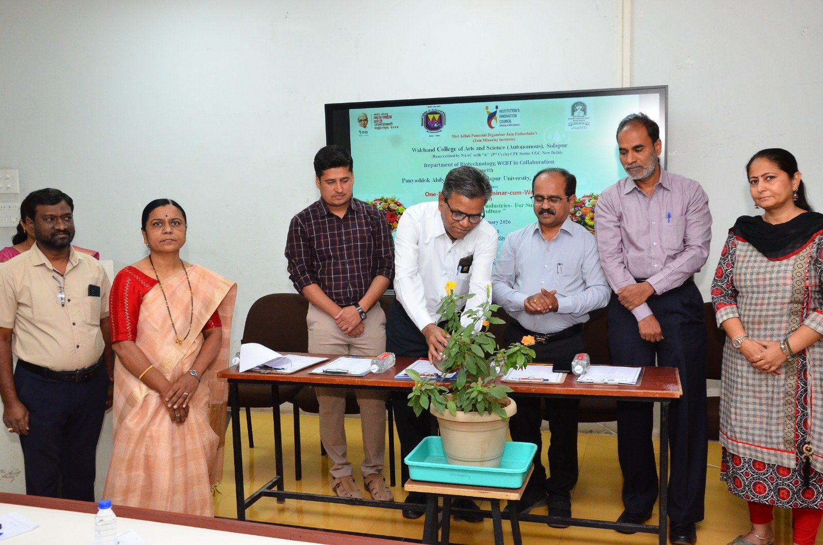 सोलापूर – वालचंद कला व विज्ञान महाविद्यालयात जैवतंत्रज्ञान विभागाच्या वतीने “बायो इनोक्युलंट इन ॲग्रो इंडस्ट्रीज फॉर सस्टेनेबल ॲग्रीकल्चर” या विषयावर राज्यस्तरीय कार्यशाळेचे यशस्वी आयोजन करण्यात आले. कृषी क्षेत्रातील शाश्वत विकास, जैवखत निर्मिती आणि औद्योगिक संधी या महत्त्वपूर्ण विषयांवर आधारित ही कार्यशाळा विद्यार्थ्यांसाठी मार्गदर्शक ठरली. कार्यक्रमास प्रमुख अतिथी म्हणून लोकमंगल महाविद्यालयाचे प्राचार्य डॉ. विकास घुटे उपस्थित होते, तर अध्यक्षस्थानी महाविद्यालयाचे प्राचार्य डॉ. संतोष कोटी होते. या कार्यक्रमात विज्ञान शाखेचे उपप्राचार्य डॉ. राजशेखर हिप्परगी आणि समन्वयक म्हणून बायोटेक्नॉलॉजी च्या विभागप्रमुख डॉ. रचना कपूर उपस्थित होते.