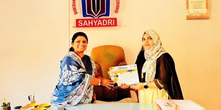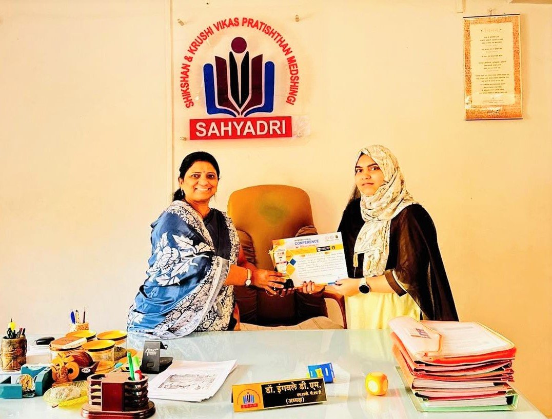 सांगोला – मेथवडे (ता.सांगोला) येथील सह्याद्री फार्मसीच्या विद्यार्थ्यांनी कै.लक्ष्मीबाई फडतरे कॉलेज ऑफ फार्मसी, कळंब, इंदापूर व लँगबसटेक युनिव्हर्सिटी न्यू जर्सी, अमेरिका, आफ्रिका, आशिया, स्कॉलर्स ग्लोबल नेटवर्क लंडन यांच्या संयुक्त विद्यमाने इंटरनॅशनल समिट ऑन फ्युचर रेडी फार्मसी, इंजिनीरिंग अँड मॅनेजमेंट सायन्स या विषयावर आयोजित केलेल्या आंतरराष्ट्रीय कॉन्फरन्समध्ये पोस्टर प्रेझेंटेशन स्पर्धेत सहभाग घेऊन सना जमादार या विद्यार्थिनीच्या सादरीकरणाने तृतीय क्रमांक पटकावला.