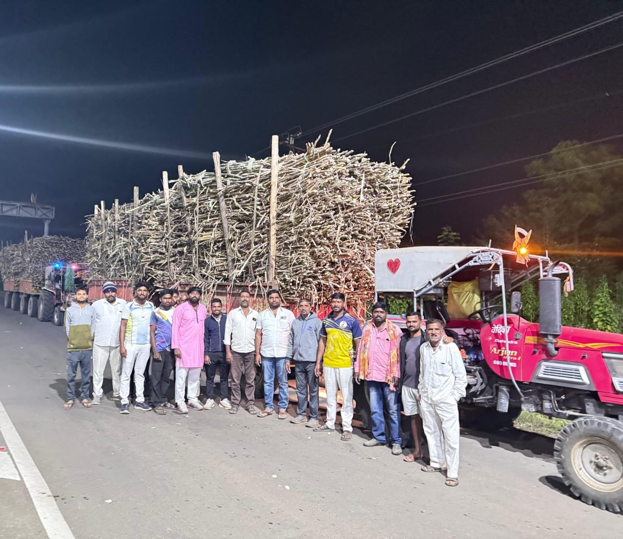 माळशिरस तालुक्यातील निमगाव पाटी येथे ऊस दरांसाठी ऊस वाहतूक रोखताना स्वाभिमानी शेतकरी संघटनेचे पदाधिकारी.