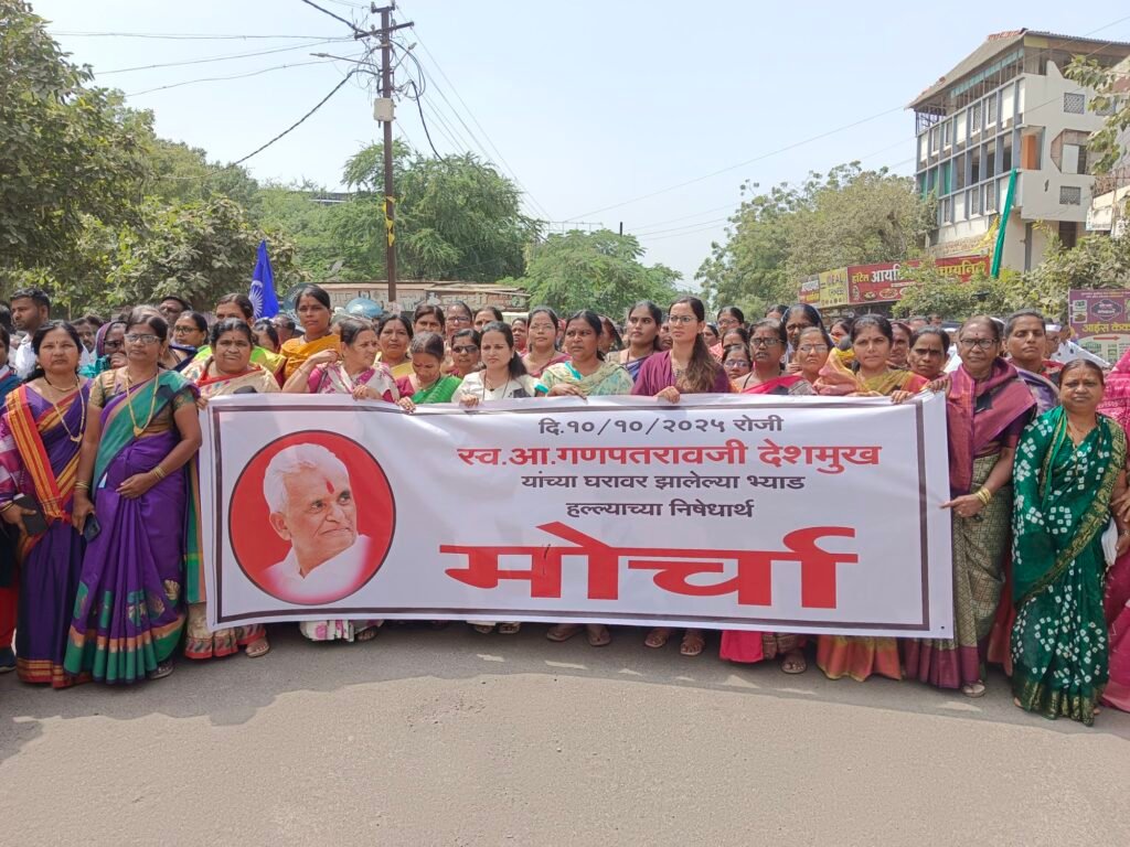 सांगोला – शेतकरी कामगार पक्षाचे माजी आ.स्व.गणपतराव देशमुख यांच्या घरावर शुक्रवार दि.१० ऑक्टोंबर रोजी दुपारी भ्याड करण्यात आला. याप्रकरणी शेतकरी कामगार पक्षाकडून शनिवार दि.११ ऑक्टोंबर रोजी सांगोला बंदची हाक देण्यात आली होती. त्यानुसार सांगोला शहरासह तालुका बंद ठेवून निषेध मोर्चा काढण्यात आला. सदर निषेध मोर्चाची सुरुवात महात्मा फुले चौक येथून करण्यात आली. यावेळी शहरातील सर्व महापुरुषांच्या पुतळ्यांना पुष्पहार अर्पण करण्यात आला. निषेध मोर्चामध्ये विविध पक्षांचे पदाधिकारी, कार्यकर्ते, महिला मोठ्या संख्येने उपस्थित होत्या.