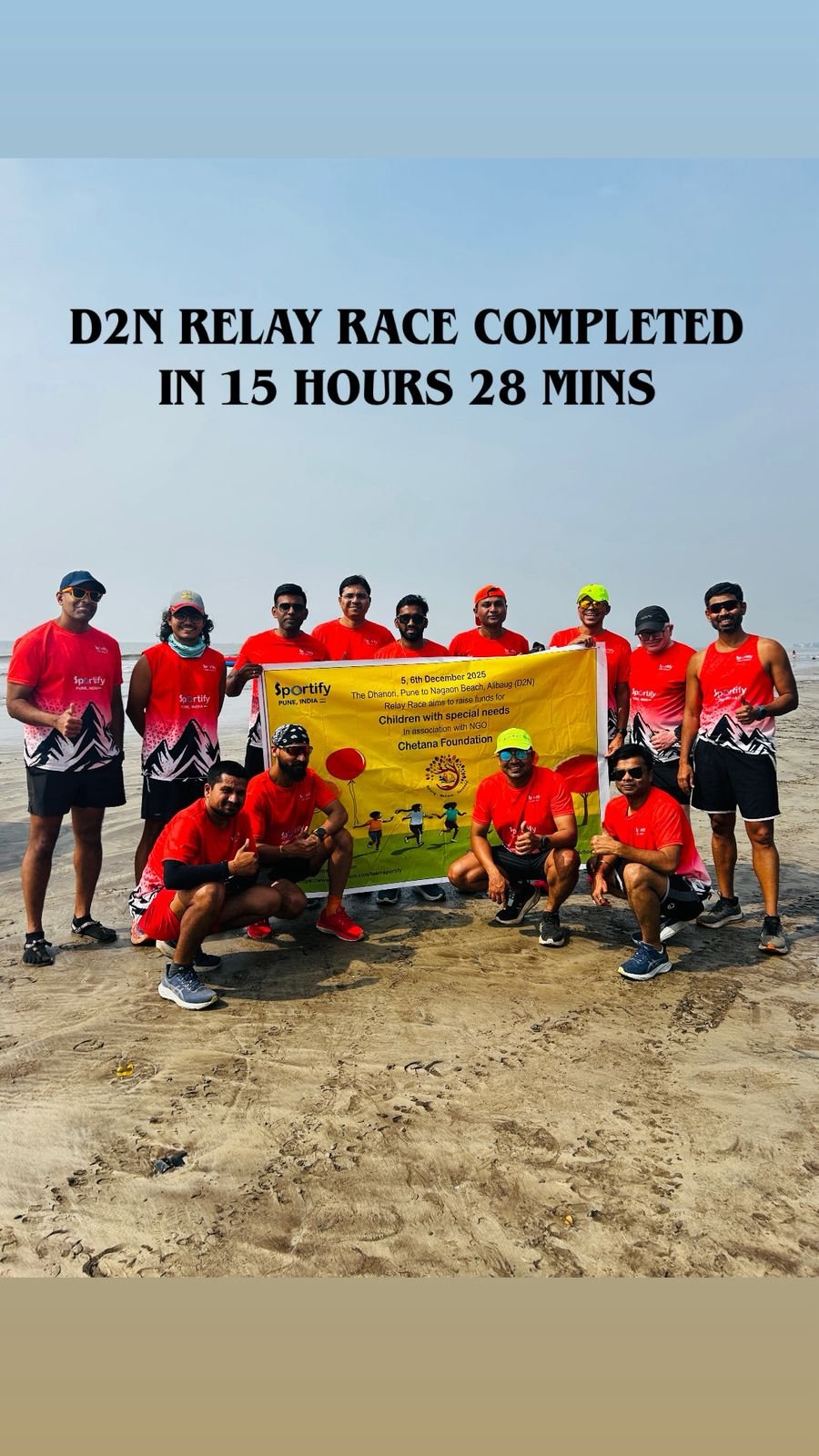 या आव्हानांना सामोरे जाऊन धावपटूंनी अपवादात्मक सहनशक्ती, शिस्त आणि संघातील समन्वय दाखवला. लांब पल्ल्याच्या धावण्याच्या संस्कृतीला प्रोत्साहन देण्यासाठी आणि विशेष गरजा असलेल्या मुलांसाठी काम करणाऱ्या एनजीओ चेतना फाउंडेशनला पाठिंबा देण्यासाठी रिलेचे आयोजन करण्यात आले होते. आम्ही त्यांच्यासाठी निधी उभारत आहोत. देणग्यांसाठी कृपया आमच्या वेबसाइट https://www.teamsportify.com/ ला भेट द्या.