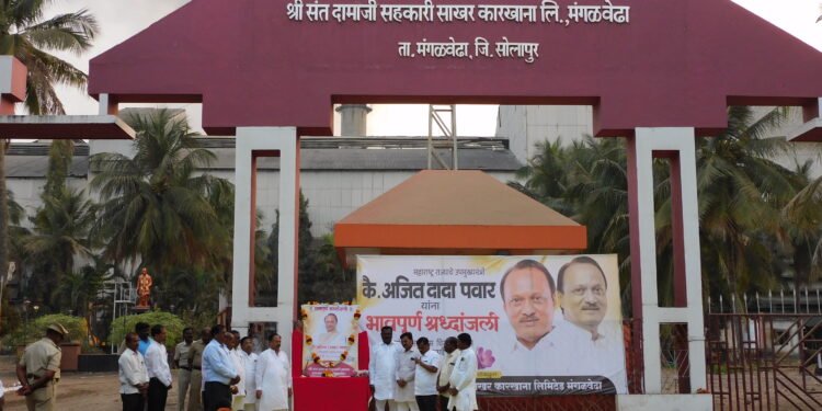 सदर प्रसंगी बोलताना कारखान्याचे चेअरमन श्री।शिवानंद पाटील म्हणाले, आदरणीय अजितदादा पवार यांचे दुर्दैवी अपघाती निधनाने आज आपल्या महाराष्ट्र राज्यावर दुःखाचा डोंगर कोसळलेला आहे। करारी नेत्रत्व। विकासाची दुरदृष्टी लाभलेला उत्तम प्रशासक आपलेतुन हरपलेला आहे। महाराष्ट्र राज्याच्या जडणघडणीत मागील पंचवीस ते तीस वर्षाचे मोलाचे योगदान अजितदादा यांनी दिलेले आहे। असा हा महाराष्ट्राचा झंझावात काळाच्या पडद्याआड गेलेला आहे। अजितदादांच्या जाण्याने महाराष्ट्र राज्यात कधीही न भरुन येणारी पोकळी निर्माण झालेली आहे। त्यांच्या कुटूंबियांना या दुःखातून सावरण्याची ताकद परमेश्वराने द्यावी अशी श्री संत दामाजी साखर कारखान्याचे सर्व संचालक मंडळ, सभासद, कर्मचारी व तालुक्यातील सर्व जनतेच्यावतीने भावपूर्ण श्रध्दांजली अर्पण करण्यात आली।