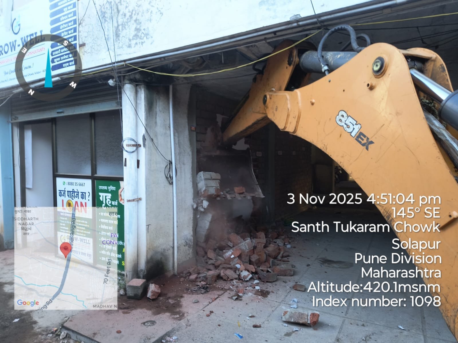सोलापूर : महापालिकेच्यावतीने उत्तर सदर बझार सी. स . नंबर टिपी 3, फायनल प्लॉट 51/4, घनाते गेलेक्स्सी येथील फ्रंट मर्जिन मधील 2 दुकाने व पार्किंग क्षेत्रातील 2 दुकाने पाडून टाकण्यात आली.