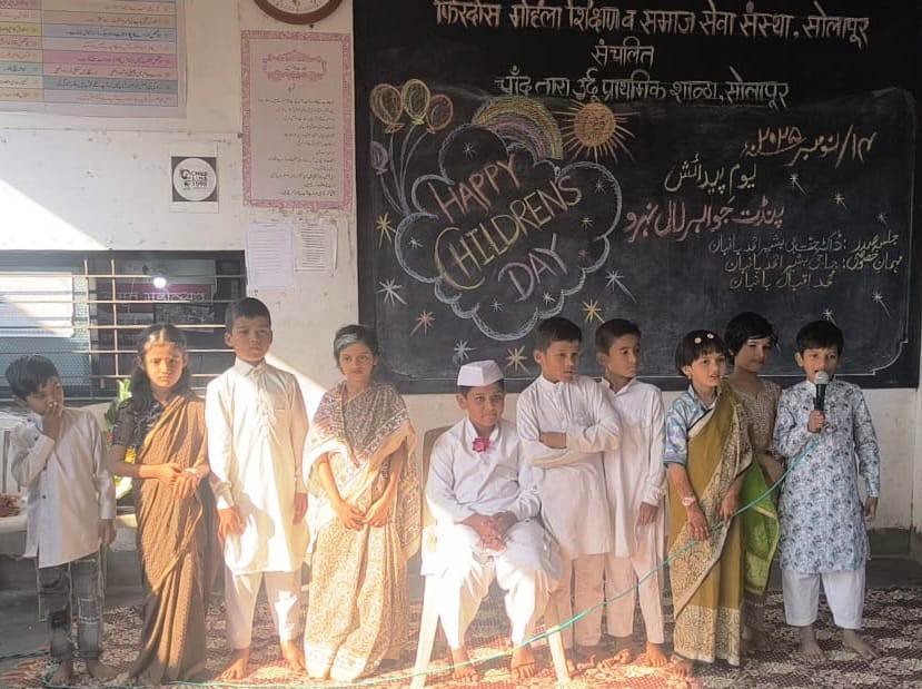 सोलापूर- फिरदोस महिला शिक्षण व समाज सेवा संस्था संचलित चाँद तारा उर्दू प्राथमिक शाळा सोलापूर या शाळेत भारताचे प्रथम पंतप्रधान पंडित जवाहरलाल नेहरू यांच्या जयंतीनिमित्त बाल दिवस मोठ्या उत्साहात साजरा करण्यात आला.