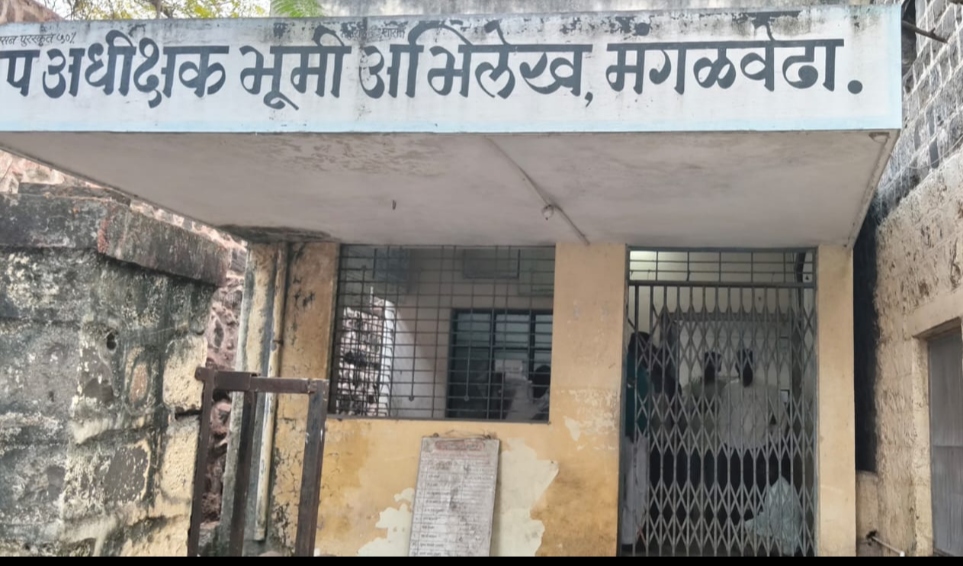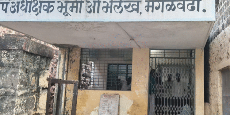 मंगळवेढा येथील भूमी अभिलेख कार्यालयाला नागरिकांनी संतापून कुलूप ठोकल्याचे छायाचित्रात दिसत आहे.
