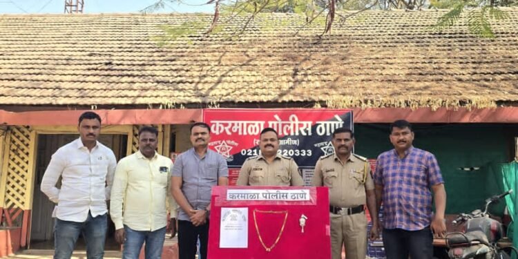 जेऊर – करमाळा पोलिसांनी करमाळा शहर व परिसरातील चोऱ्यावरती नियंत्रण व झालेल्या चोऱ्यांचा शोध तात्काळ लावण्याचा धडाका नवीन वर्षात ही सुरूच ठेवला आहे. पाच लाख अंशी हजाराच्या मोठ्या चोरीचा शोध चोवीस तासाच्या आत लावून सामान्य नागरिकांना दिलासा दिला आहे. कालच्या चोरीत डोंबिवली येथून सुलोचना मच्छिंद्र लोहार नातुच्या लग्नाला वरकटणे ता करमाळा येथे आलेल्या असता लग्न कार्यक्रमानंर त्या त्यांचा भाचा बाबासाहेब नंदरगे करमाळा येथे मुक्कामी थांबल्या. दुसऱ्या दिवशी एसटी प्रवासात त्यांचेजवळील ५ तोळे वजनाचे गंठण व चांदीचा छल्ला गर्दीचा फायदा घेत चोरट्यानी चोरला. त्यानंतर त्यांनी करमाळा पोलिस ठाण्यात तक्रार नोंदवली.