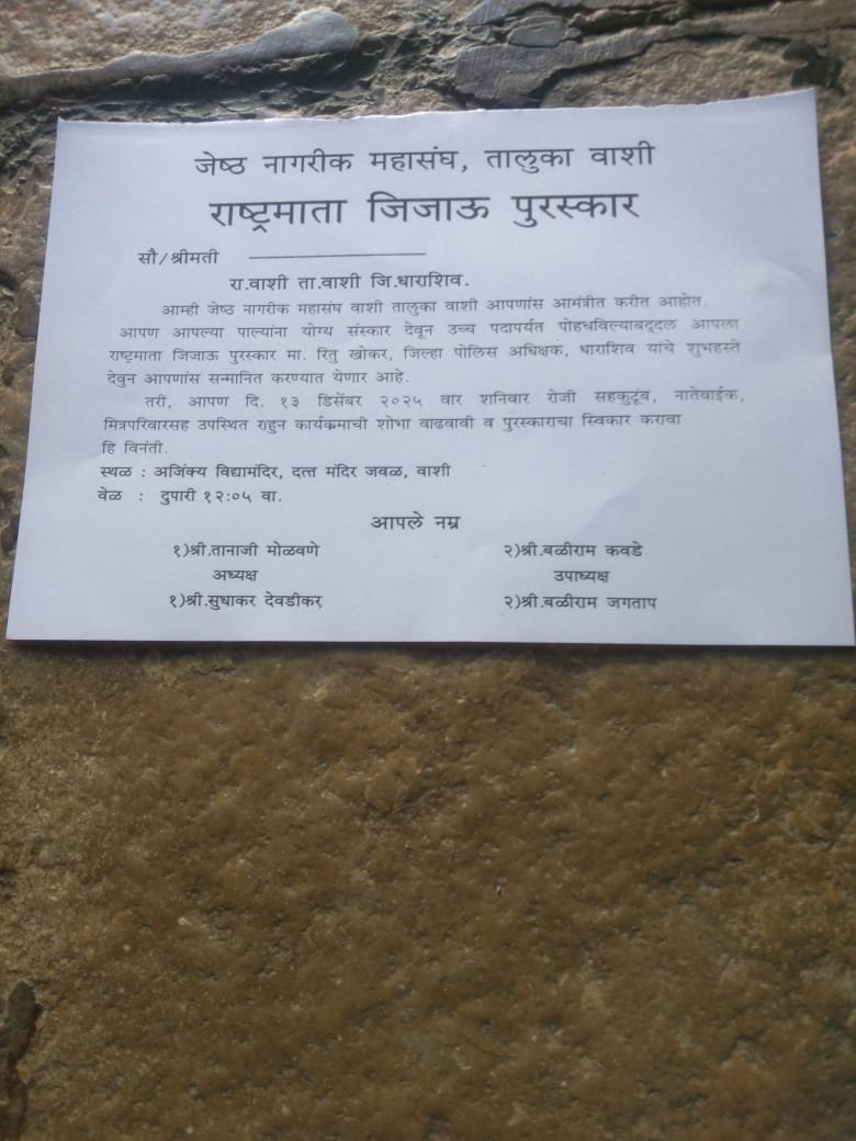 धारशिव – ज्येष्ठ नागरिक महासंघ तालुका वाशी यांच्याकडून वाशी येथील ज्या महिलांनी आपल्या पाल्यांना योग्य संस्कार देऊन उच्च पदापर्यंत पोहचवले.औ अशा वाशी येथील ५१ महिलांना राष्ट्रमाता जिजाऊ पुरस्कार धाराशिव जिल्ह्याचे कर्तबगार अशा जिल्हा पोलीस अध्यक्ष रिथु खोकर यांच्या हस्ते दि.१३/१२/२०२५ रोजी अजिंक्य विद्या मंदिर वाशी येथे पुरस्कार देण्यात येणार आहे.