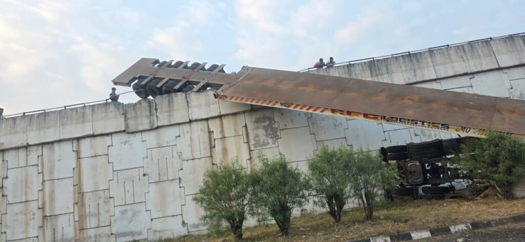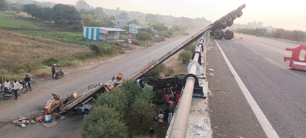 मोडनिंब – सोलापूर-पुणे महामार्गावर मोडनिंब (ता. माढा) येथे उड्डाणपुलावरून कंटेनर वाहतूक करणारा ट्रेलर खाली कोसळला. सोमवार दि. २४ नोव्हेंबर रोजी पहाटे पावणे पाचच्या सुमारास सोलापूरहून पुण्याकडे कंटेनर वाहतूक करणारा रिकामा ट्रेलर (क्र. सीजे ३९ सी २७००) जात असताना उड्डाणपुलावर आल्यानंतर चालकाचा वाहनावरील ताबा सुटला.त्यानंतर दुभाजक ओलांडून विरुद्ध दिशेच्या बाजूने हा ट्रेलर पुलावरून अर्धवट अवस्थेत खाली कोसळला.