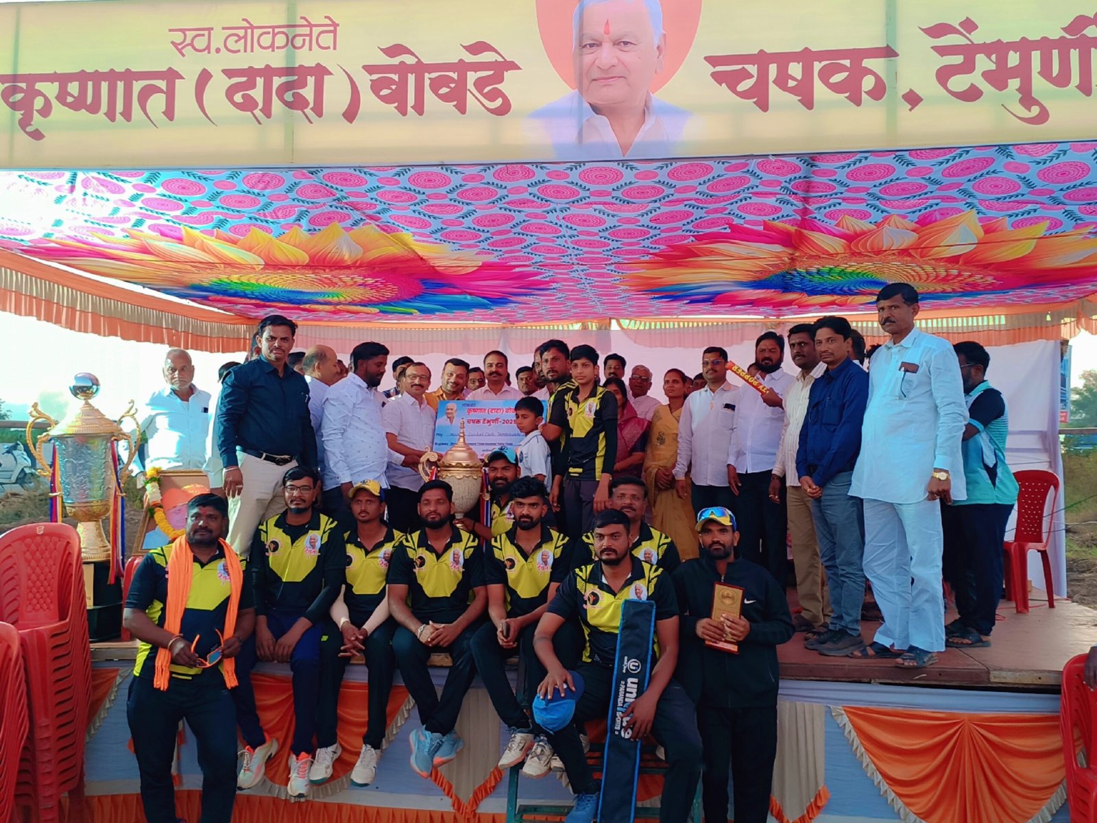 टेंभुर्णी – स्व. लोकनेते कृष्णात बोबडे यांच्या पाचव्या स्मृतिदिनानिमित्त आयोजित करण्यात आलेल्या लोकनेते स्व. कृष्णात बोबडे चषक टेंभुर्णी या भव्य टेनिस बॉल क्रिकेट स्पर्धा २०२५ चा समारोप उत्साहात पार पडला. या स्पर्धेत तुळजापूरच्या शौर्य इलेव्हन संघाने उत्कृष्ट कामगिरी करत प्रथम क्रमांक पटकावून चषकावर आपले नाव कोरले.