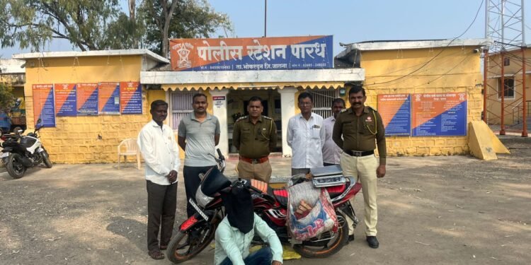 पारध / जालना – भोकरदन तालुक्यातील पारध पोलीस स्टेशन हदीतील आज दि. 27/11/2025 रोजी सकाळी अंदाजे साडेनऊ वाजेच्या दरम्यान रेणुकाई पिंपळगांव ते वाकडी अन्वा रोडवर कल्याणी गावाजवळ एक फशन प्रो कंपनीची MH020B6324 या दुचाकी मोटार सायकल वर 15 किलो गोवंश जातीचे मास विनापरवाना विक्री करण्यासाठी आरोपी शे जावेद शे खाजा, शेख अल्ताफ शेख इक्राम कुरेशी दोन्ही रा. कठोराबबाजार ता भोकरदन जि.जालना यांच्याकडुन तीन हजार रुपयाचे पंधरां किलो गोवंश चें मास, साठ हजार रुपयाची मोटार सायकलं, व बाराशे रुपयाचा वजन काटा एकुण चौसष्ट हजार दोनशे रुपयाचा मुदेमाल जप्त केला व दोन्ही आरोपींना रंगेहाथ पकडुन अटक केले.