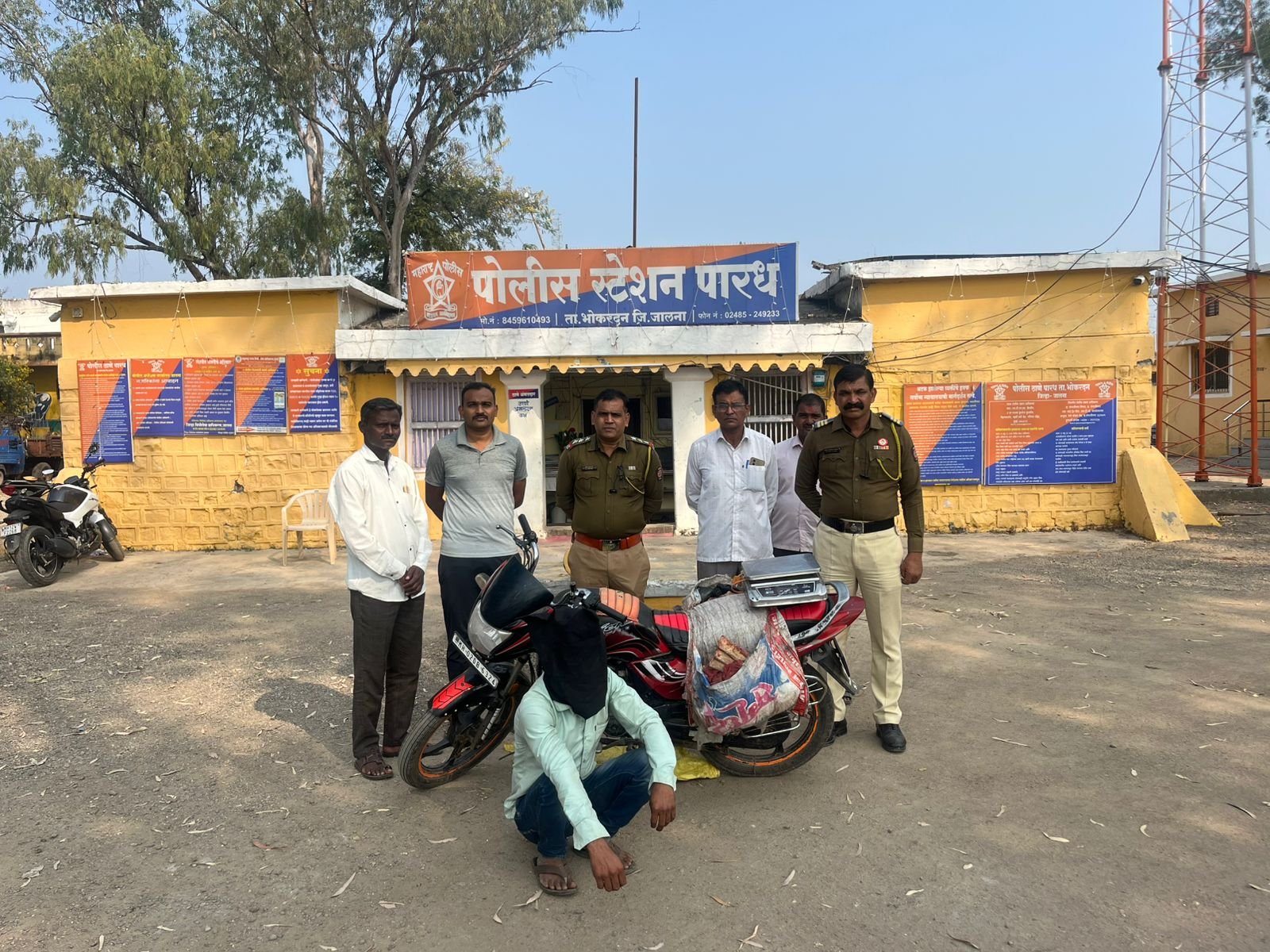 पारध / जालना – भोकरदन तालुक्यातील पारध पोलीस स्टेशन हदीतील आज दि. 27/11/2025 रोजी सकाळी अंदाजे साडेनऊ वाजेच्या दरम्यान रेणुकाई पिंपळगांव ते वाकडी अन्वा रोडवर कल्याणी गावाजवळ एक फशन प्रो कंपनीची MH020B6324 या दुचाकी मोटार सायकल वर 15 किलो गोवंश जातीचे मास विनापरवाना विक्री करण्यासाठी आरोपी शे जावेद शे खाजा, शेख अल्ताफ शेख इक्राम कुरेशी दोन्ही रा. कठोराबबाजार ता भोकरदन जि.जालना यांच्याकडुन तीन हजार रुपयाचे पंधरां किलो गोवंश चें मास, साठ हजार रुपयाची मोटार सायकलं, व बाराशे रुपयाचा वजन काटा एकुण चौसष्ट हजार दोनशे रुपयाचा मुदेमाल जप्त केला व दोन्ही आरोपींना रंगेहाथ पकडुन अटक केले.